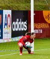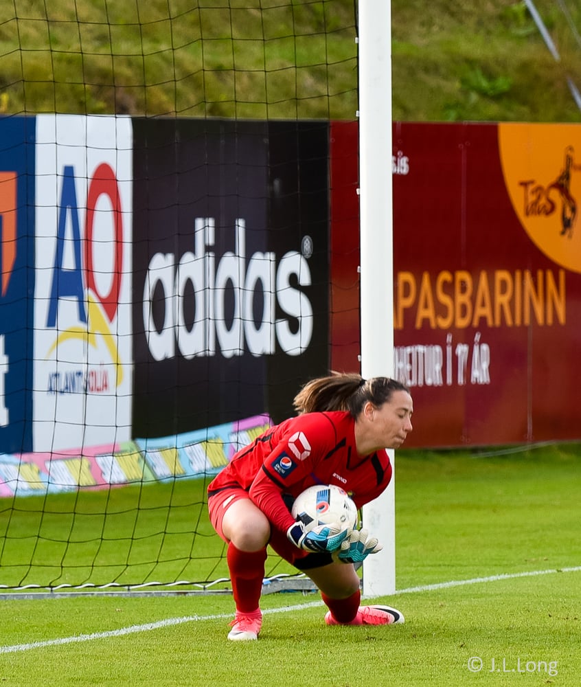 Það er bara sama uppskrift!! Viviane grípur aukaspyrnuna frá Guðnýju. Hún var þó tiltölulega beint á hana en það er sama, hún var föst.