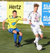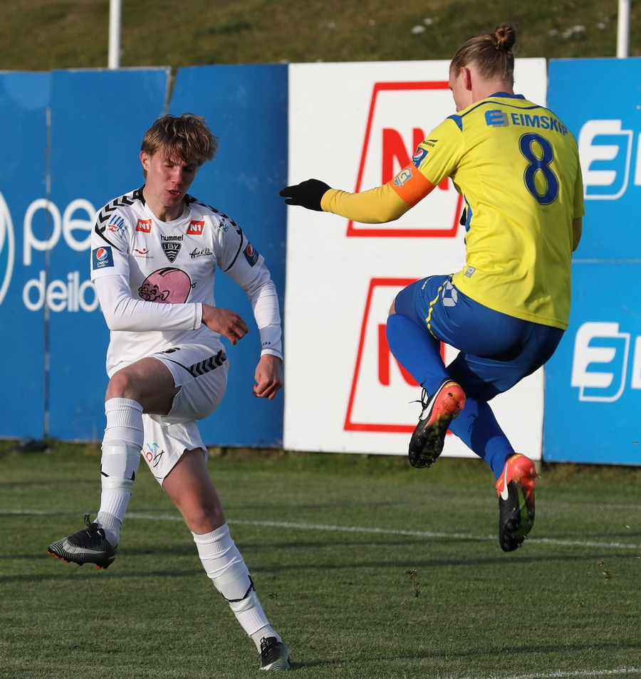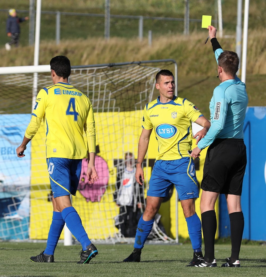 Arnór Gauti er að byrja af þvílíkum krafti hérna Simon Smidt ræður ekki við hraðann og kraftinn í honum og tekur hann niður verðskuldað spjald.
