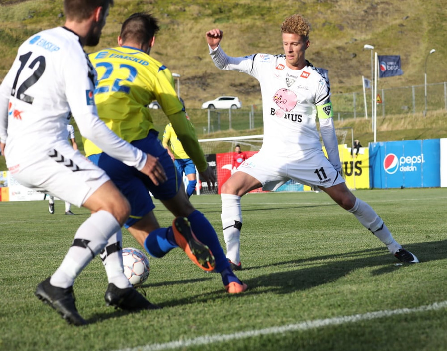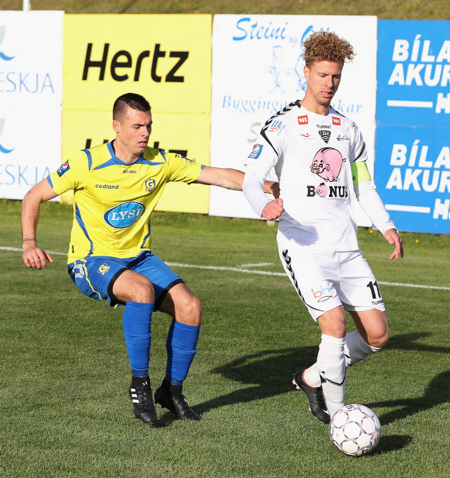 Eyjamenn eru að spila þetta mjög taktískt og það virðist vera að virka ða leyfa Grindvíkingum að vera með boltann. Hvernig bregðast Grindvíkingar við þessari vatnstusku.