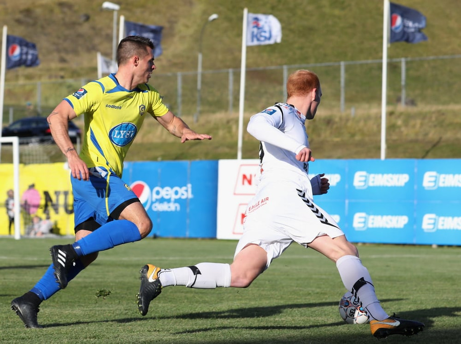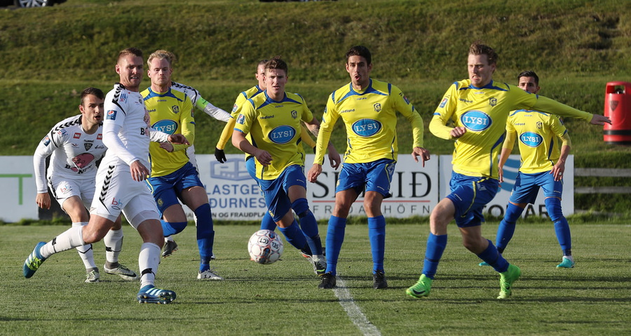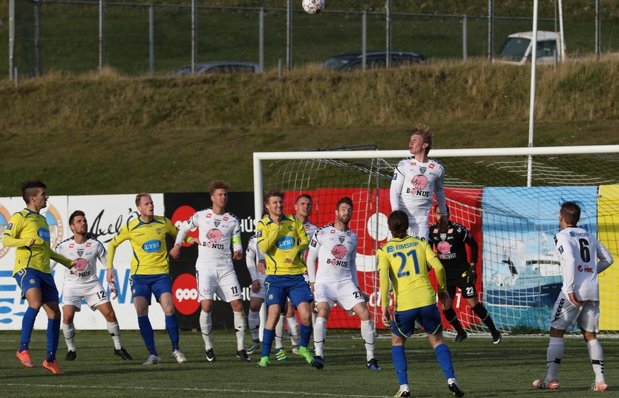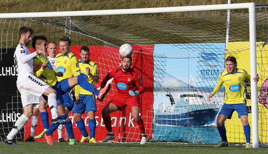Grindvíkingar leita mikið að Andra Rúnari skiljanlega enda þeirra hættulegasti maður. Þessar sendingar eru samt erfiðar í vindinum háar og lausar.