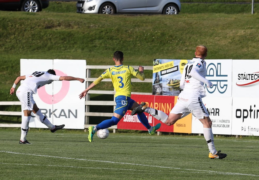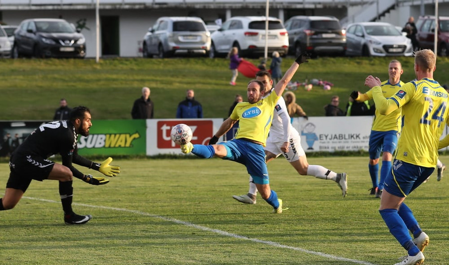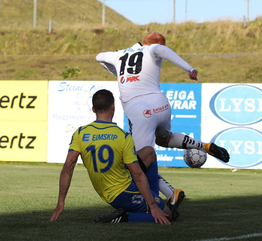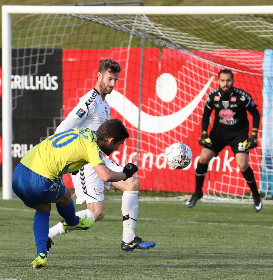 HVAÐ ER AÐ GERAST?! Shahab er kominn með tvö mörk í dag! Það kemur langur bolti fram á Arnór Gauti sem tekur boltann niður, Sindri Snær kemur og setur boltann á Shahab sem kemur sér í gegnum varnarmann og skorar framhjá Jajalo. 2-0 !!!