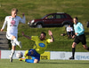 Sam Hewson hleypur hér á Pablo Punyed og liggur eftir haldandi um andlitið á sér en þetta vriðist ekki neitt.
