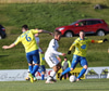 Alexander Veigar með frábær tilþrif þegar hann sólar varnarmenn ÍBV en er ekki í nógu góðu jafnvægi í skotin og skotið hans fer framhjá.