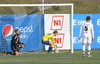 Sindri tekur spyrnuna og hún er mjög góð en Jajalo nær að slá boltann í horn.