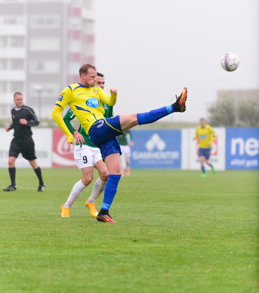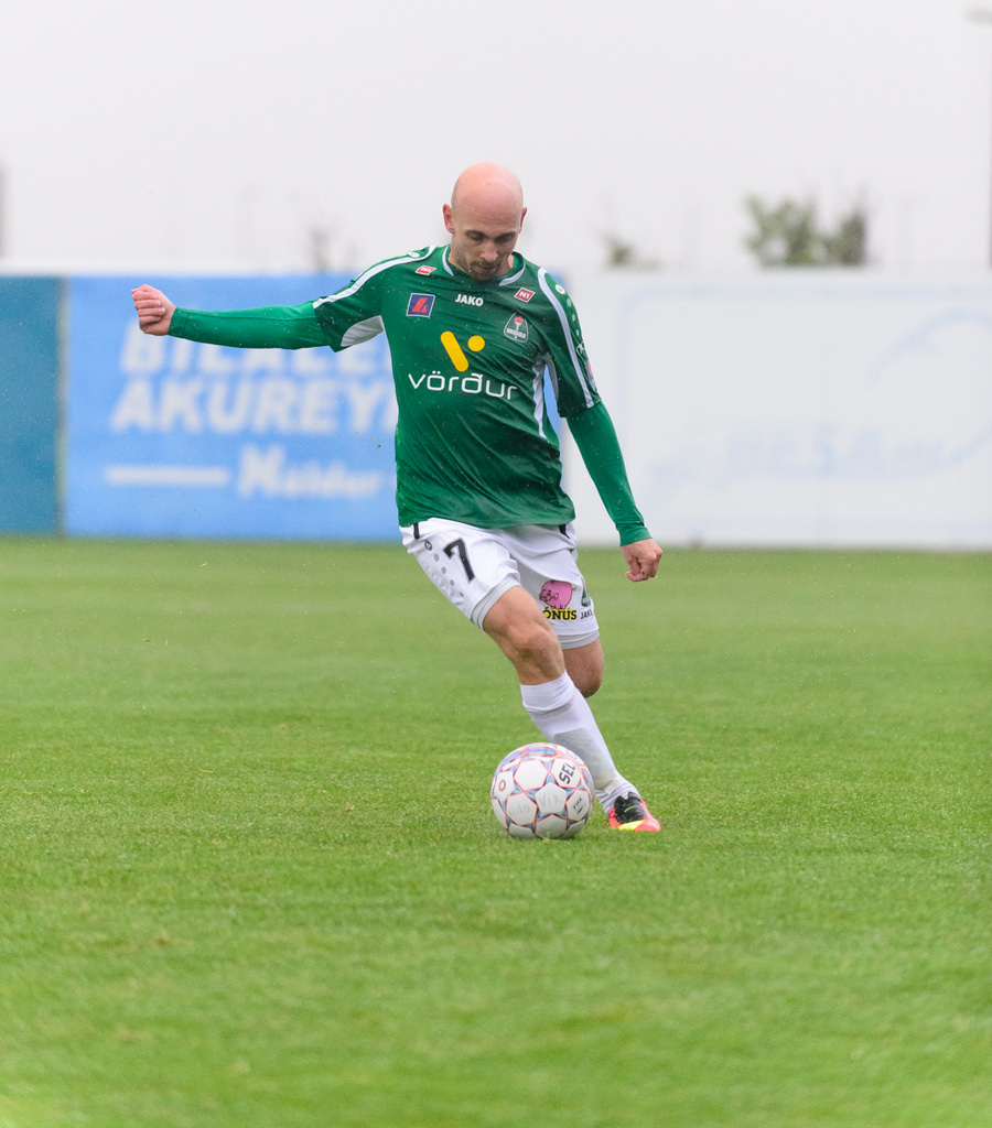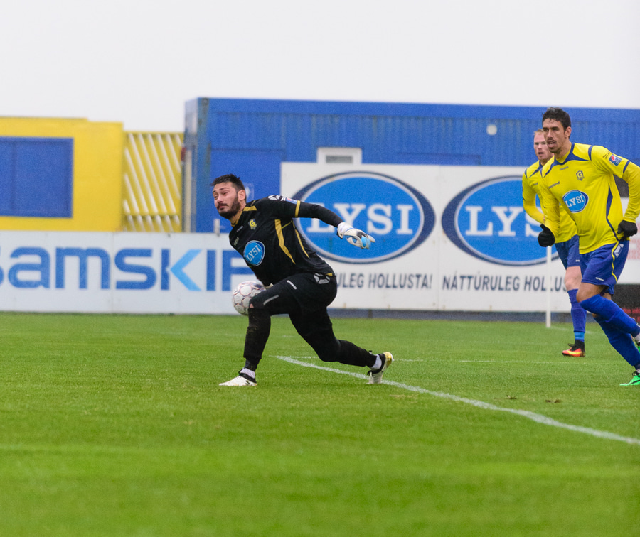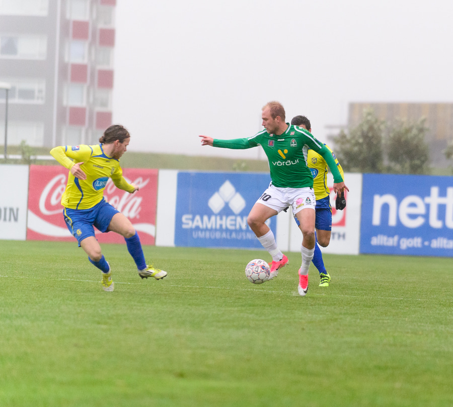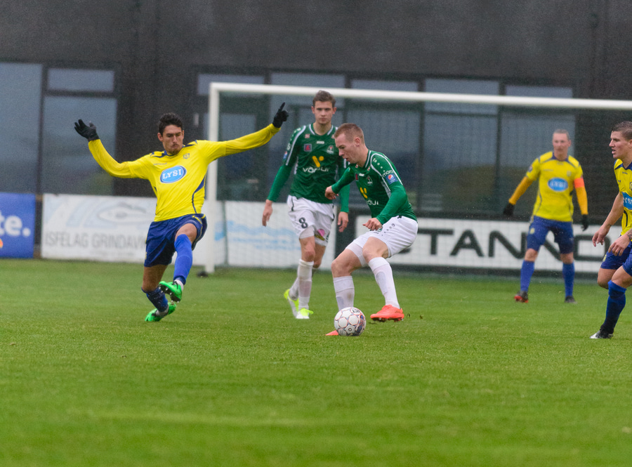 Það rigndi duglega hérna í Grindavík í gær og er völlurinn mjög blautur og þungur. Getur orðið afar erfiður leikur. William Daniels var rétt í þessu að fljúga hressilega á hausinn þegar hann var að skjóta á markið