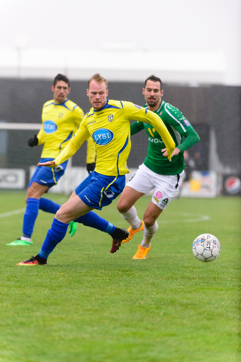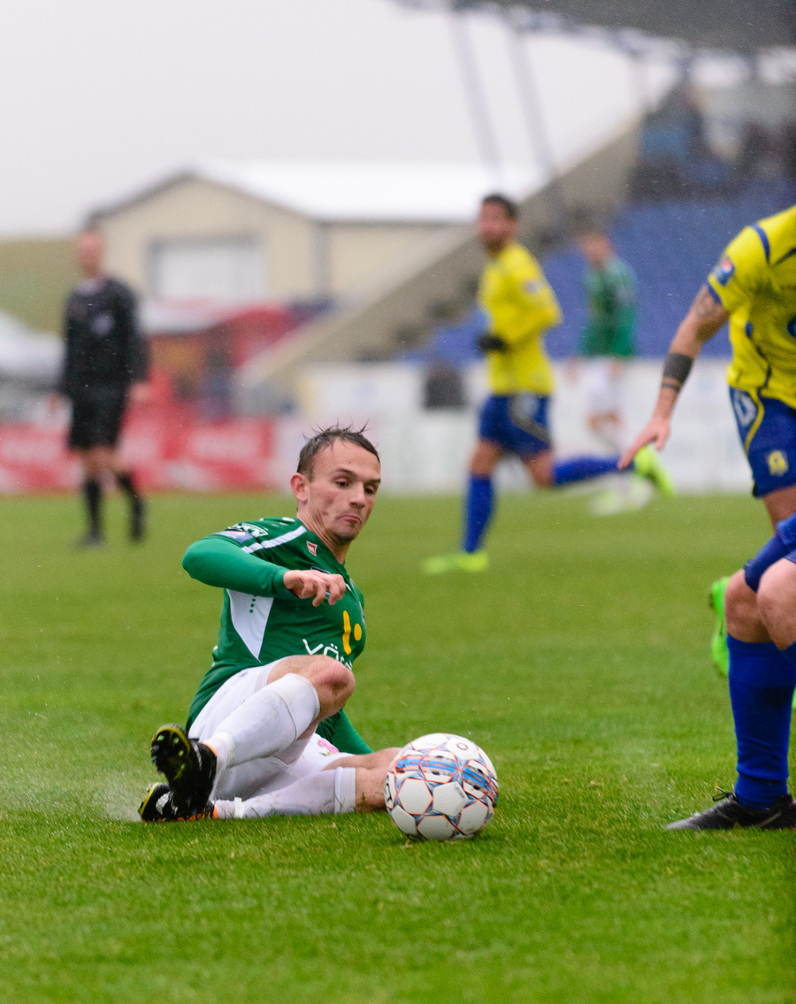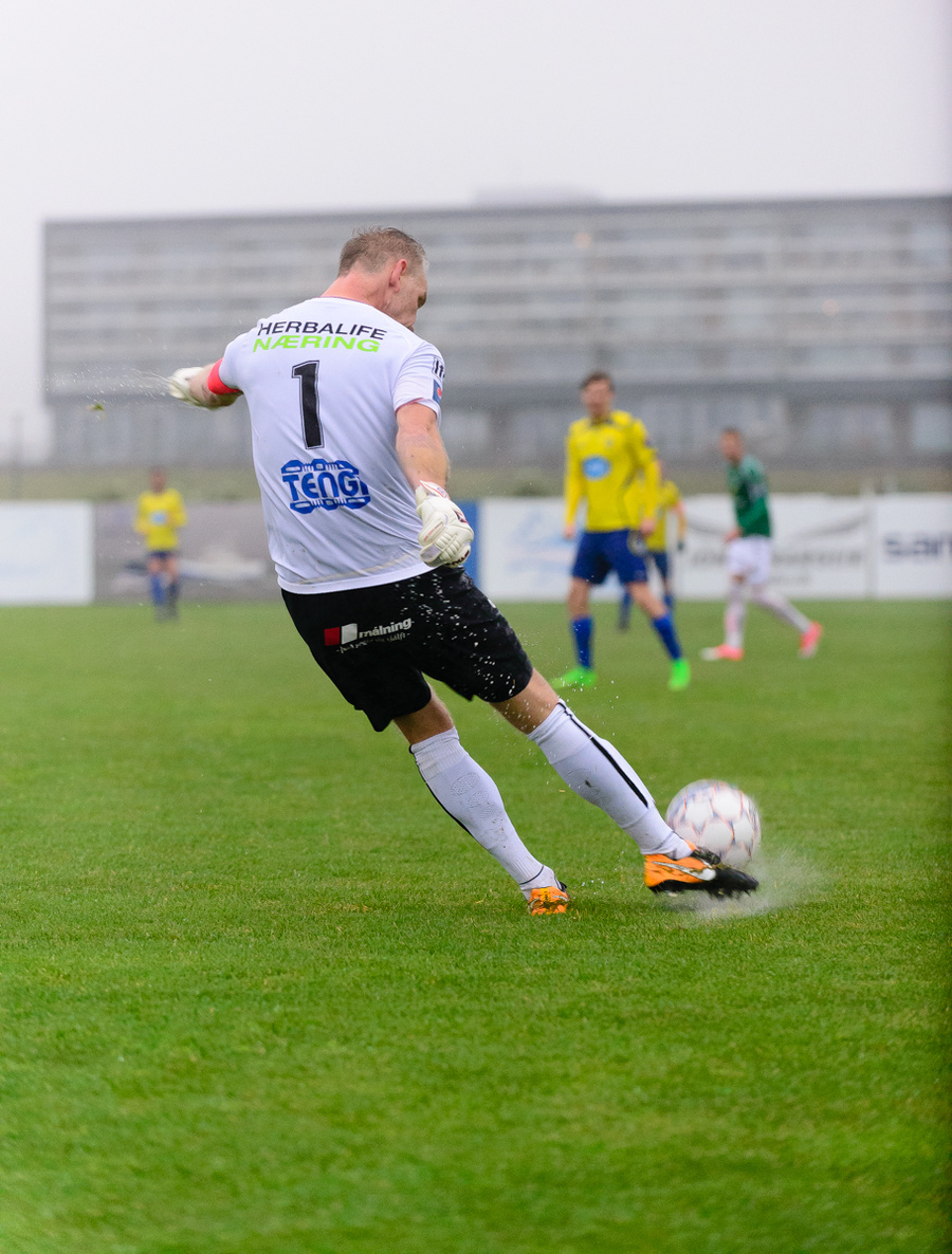 Það rigndi duglega hérna í Grindavík í gær og er völlurinn mjög blautur og þungur. Getur orðið afar erfiður leikur. William Daniels var rétt í þessu að fljúga hressilega á hausinn þegar hann var að skjóta á markið