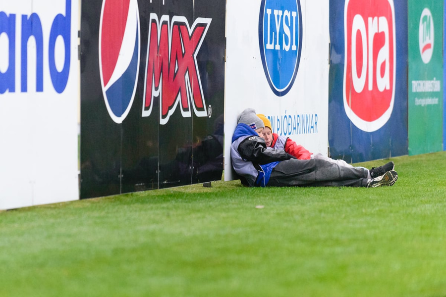 Það fer misvel í fólk að leiknum hafi verið seinkað vegna skorts á myndatökumanni fyrir sjónvarpið. Beggi vallarstjóri segir að það eigi að bæta í vindinn. Það vita allir hvað lognið getur farið hratt yfir hérna í Grindavíkinni og nennum við því ekki.