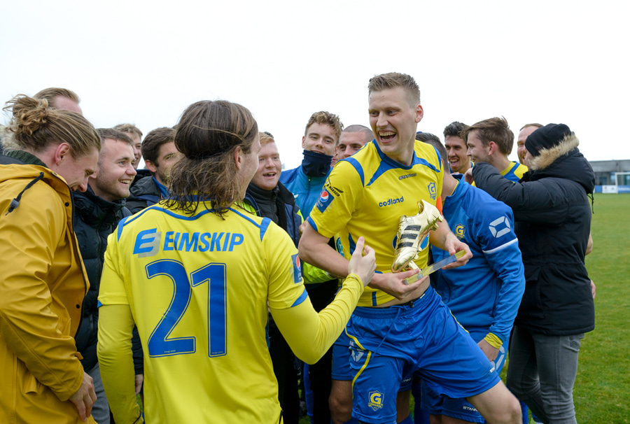Leik lokið og Grindavík klárar mótið með sigri! Fyrirsagnirnar verða hins vegar um Andra Rúnar Bjarnason sem jafnaði markametið gamla. Andri Rúnar er fimmti leikmaðurinn í 19. marka klúbbinn. Skýrsla og viðtöl á leiðinni. Leikmenn tollera Andra Rúnar sem heldur á gullskó Adidas. Þá vil ég nota tækifærið og þakka fyrir mig í sumar. Þetta var skemmtilegt. Lokaorð mín til ykkar verða: Beggi vallarstjóri