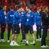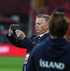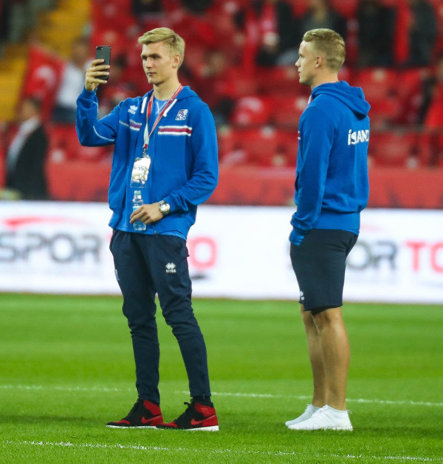 Strákarnir okkar mættir út á völl að rölta um og skoða aðstæður. Baulað hressilega á þá. Fólk er veifandi tyrkneskum fánum og mikið stuð.
