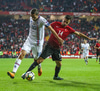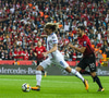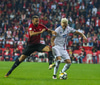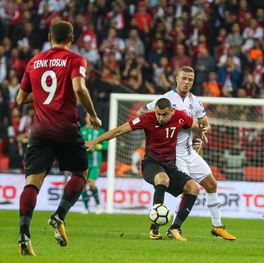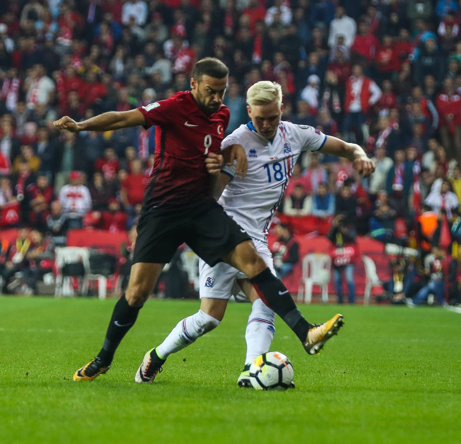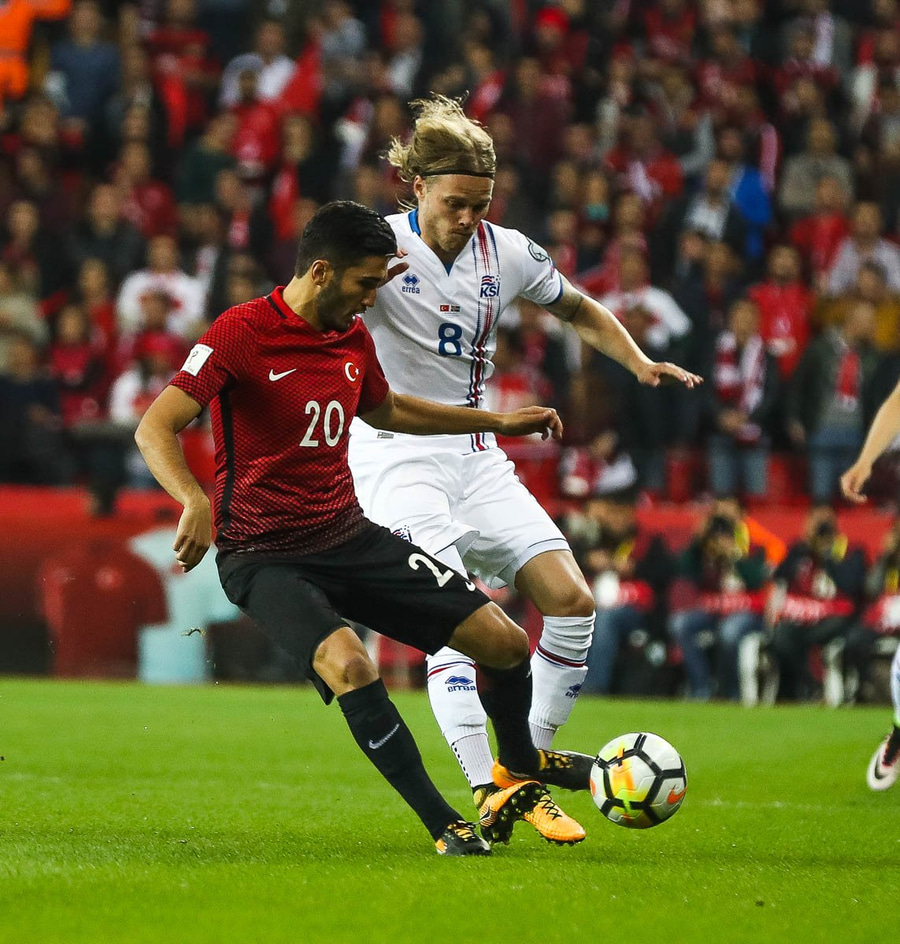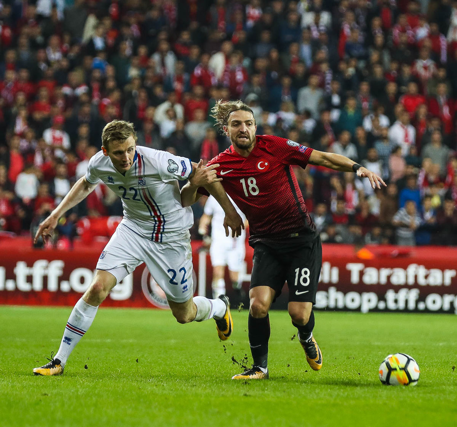 Arda Turan fær gult fyrir brot á Aroni Einari. Aron liggur á vellinum og þarf aðhlynningu.