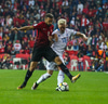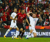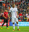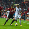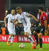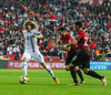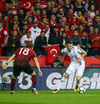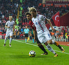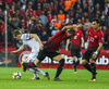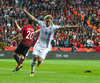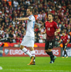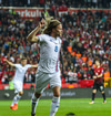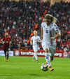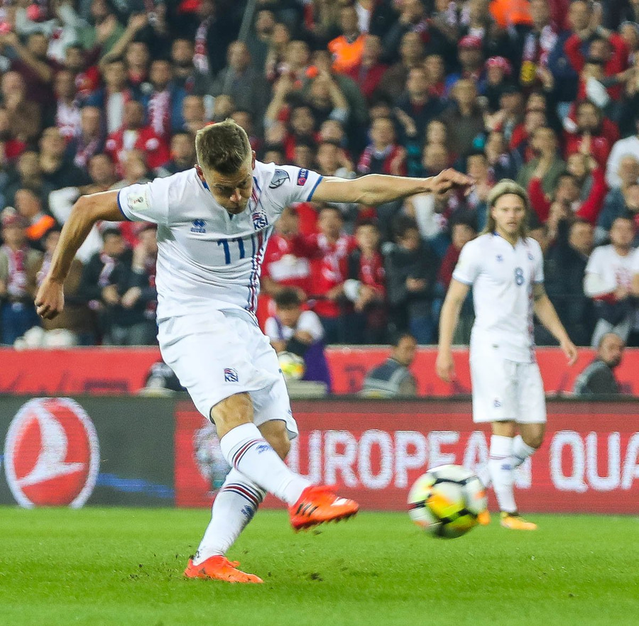 Tyrkirnir eiga í rosalegu basli með hann. Hann var umkringdur í teignum en náði á einhvern ótrúlegan hátt að renna boltanum á Birki Bjarnason. Svakaleg stunga og Birkir skaut boltanum upp í þaknetið!!! ÖNNUR rosaleg afgreiðsla.