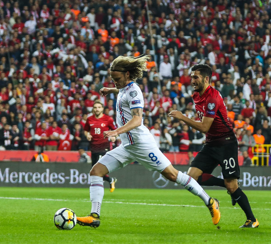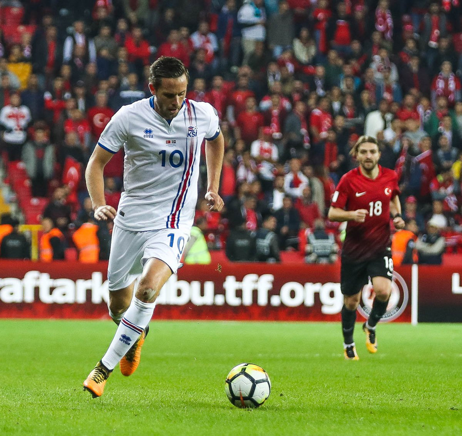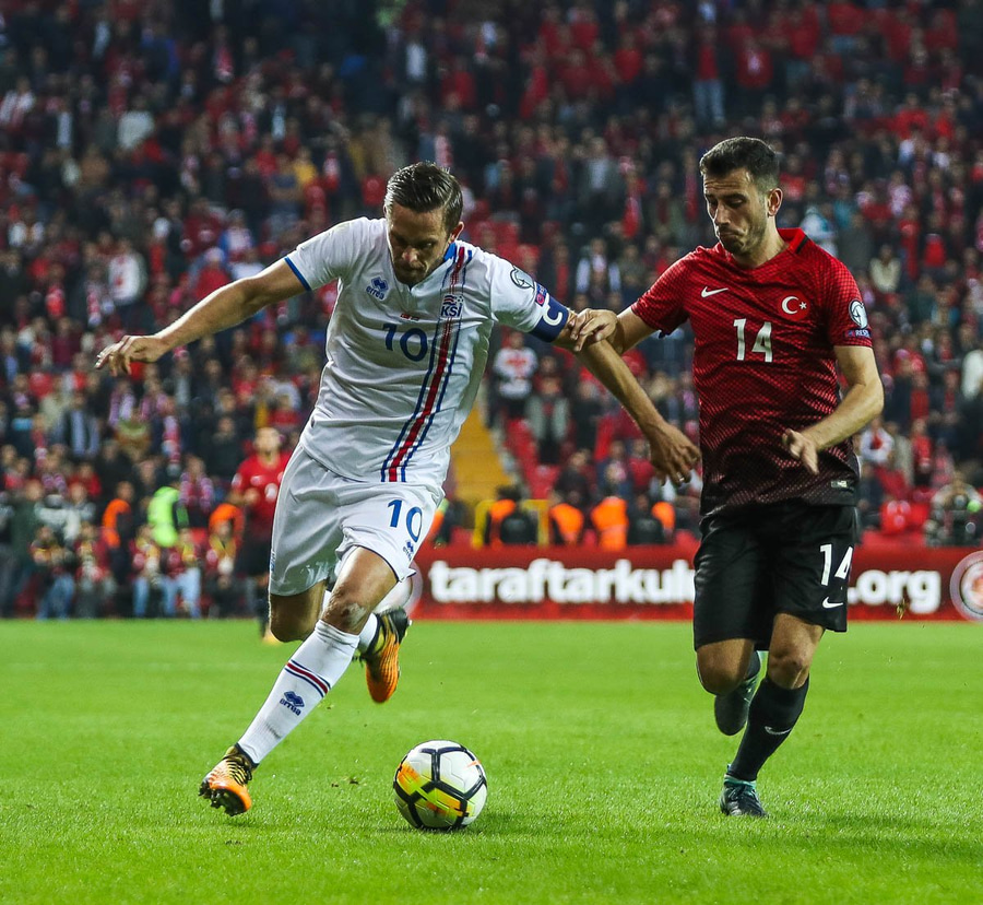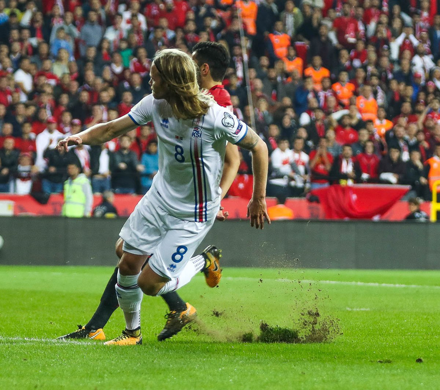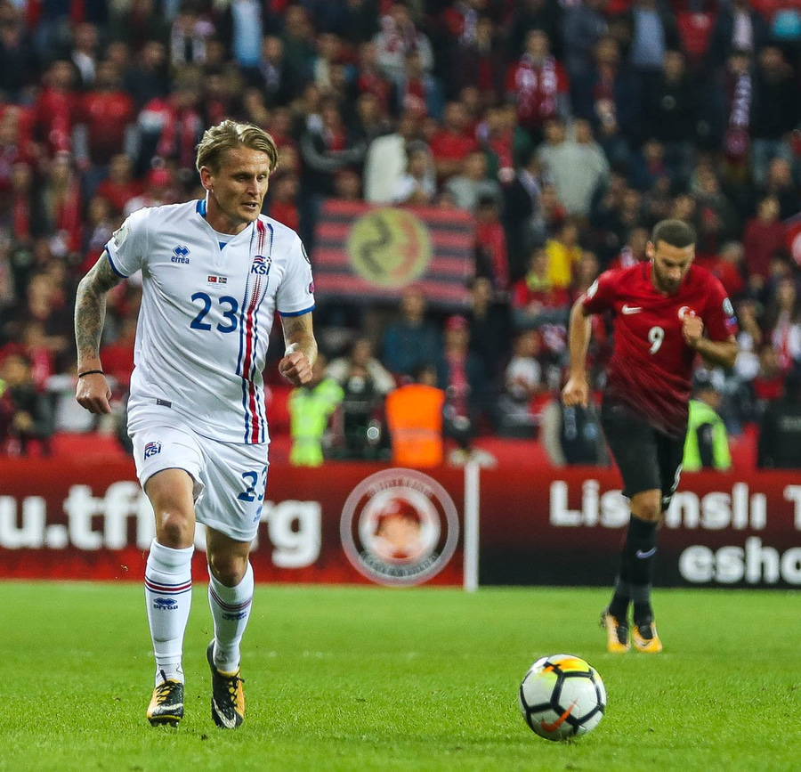Fyrst átti Jói Berg skot sem fór í varnarmann og barst til Gylfa rétt fyrir utan teiginn. Gylfi lét vaða og náði hörkuskoti sem Volkan í marki Tyrkja rétt náði að slá yfir í hornspyrnu!