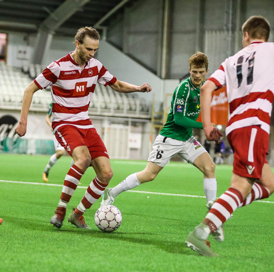 Casper Olesen kemst í færi eftir gott spil. Varnarmenn HK bjarga á síðustu stundu.