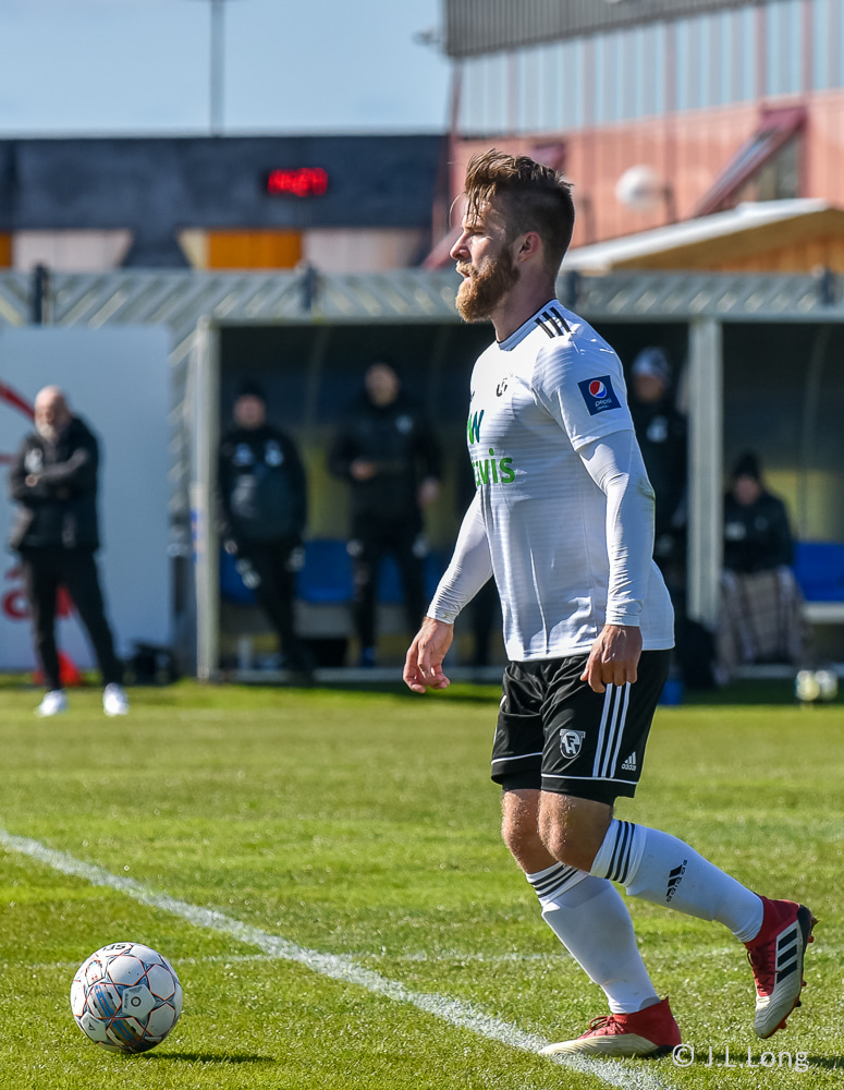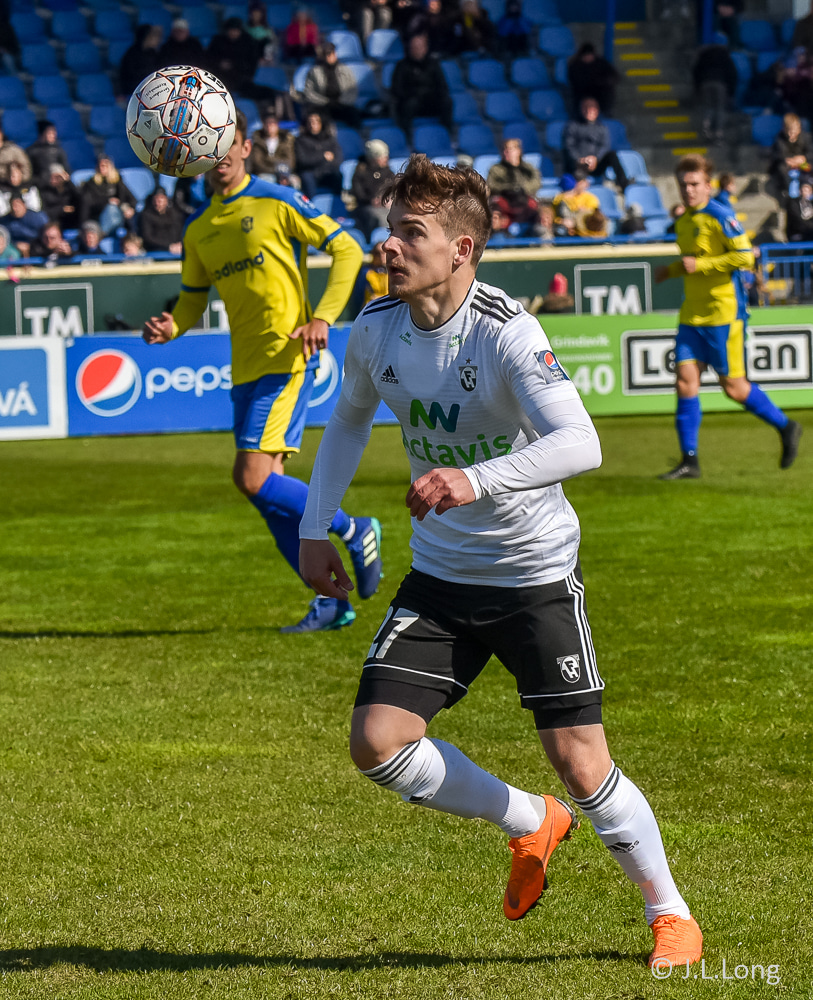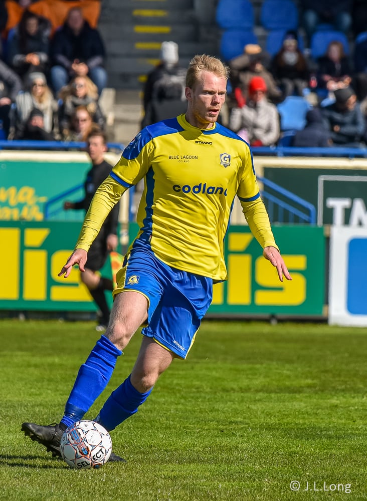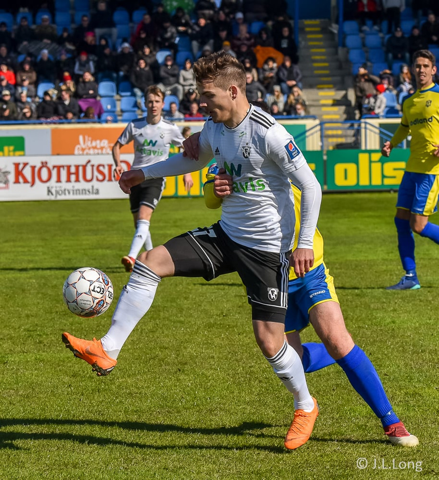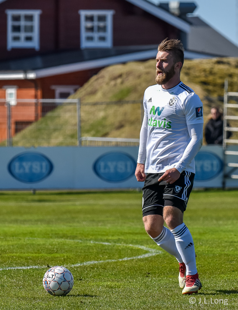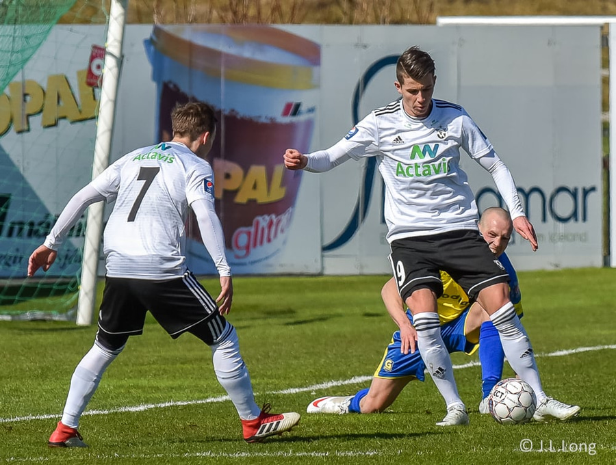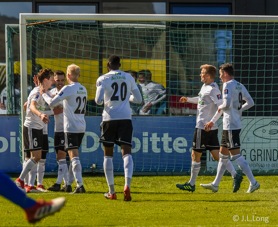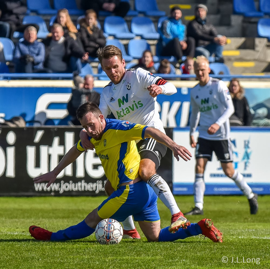 Rene brýtur á Hirti Loga, virtist fara í boltann fyrst en aukaspyrna dæmd. Halldór Orri óánægður með Færeyinginn og ýtir við honum. Helgi Mikael ekki lengi að lyfta upp spjaldinu
