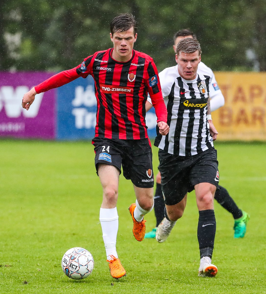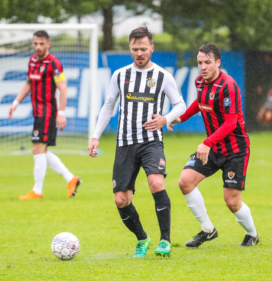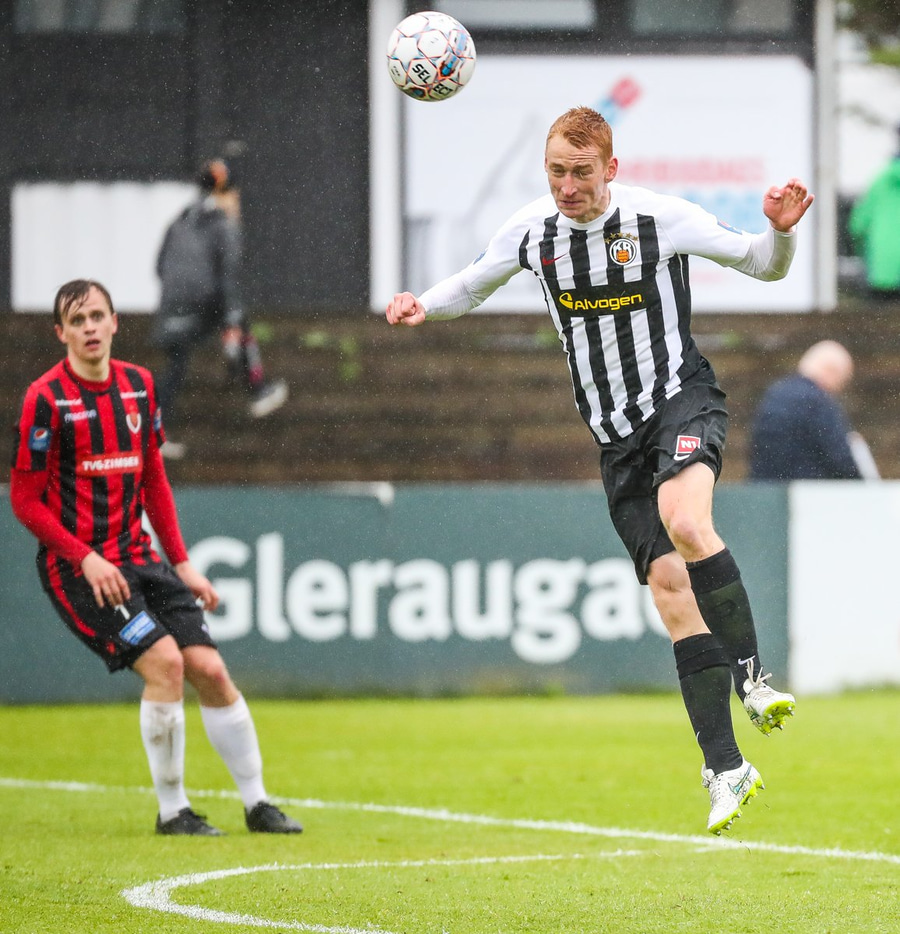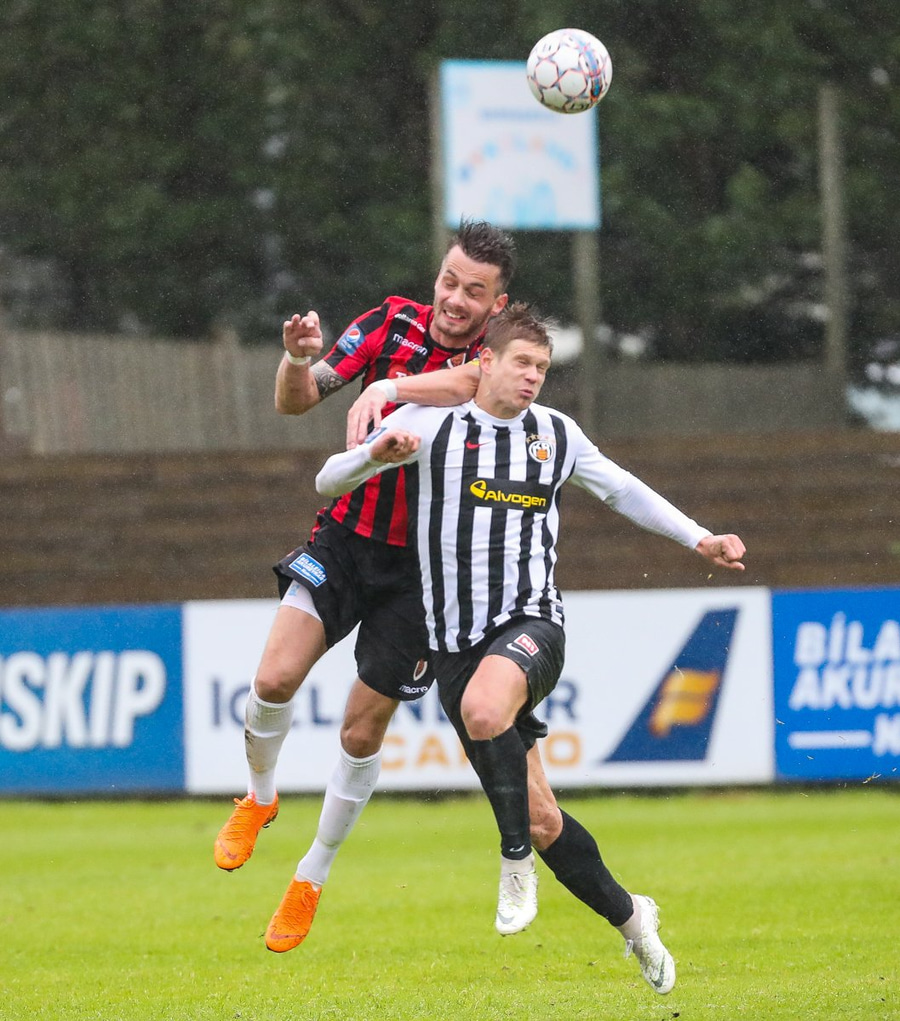 Tók 20 sekúndur að fá fyrstu tæklinguna á rennblautum vellinum, Finnur Orri hendir sér í eina góða og tekur niður Alex Frey á miðjum vellinum.