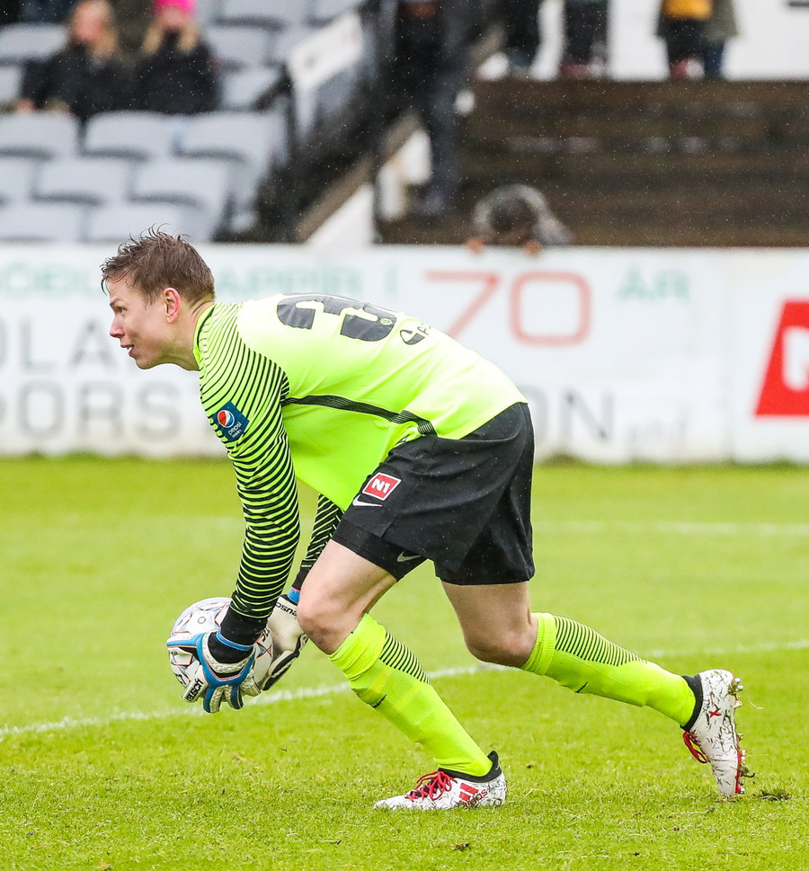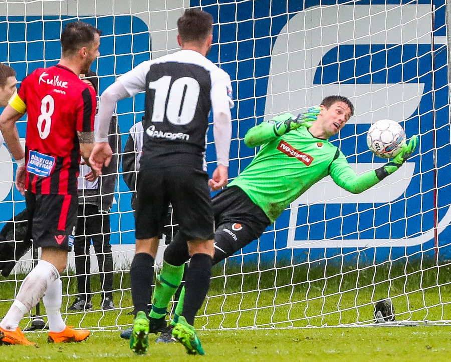 Bjarni Páll kominn upp að endalínu inni í teig og ætlar að koma honum fyrir á Alex en Beitir nær höndum á boltann eftir að hafa misst hann fyrst.
