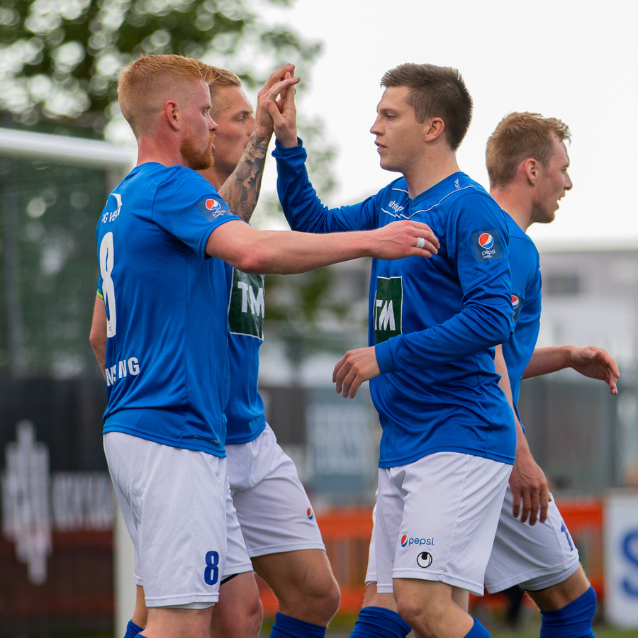 Liðið fékk aukaspyrnu eftir að Andri Rafn Yeoman braut á Þorsteini Má á miðjum vallarhelmingi Blika. Hilmar Árni átti sendingu inn í teiginn upp á 10. Baldur hafði betur í baráttu við Viktor í teignum og kláraði frábærlega með fyrsta í fjærhornið.