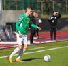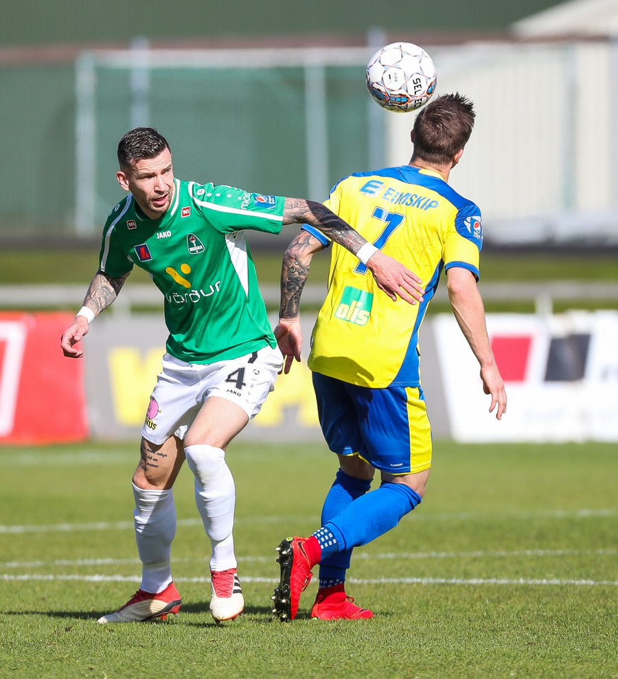 Hættuleg sending á Mikkelsen í teignum en Marinó Axel bjargar með hörkutæklingu.
