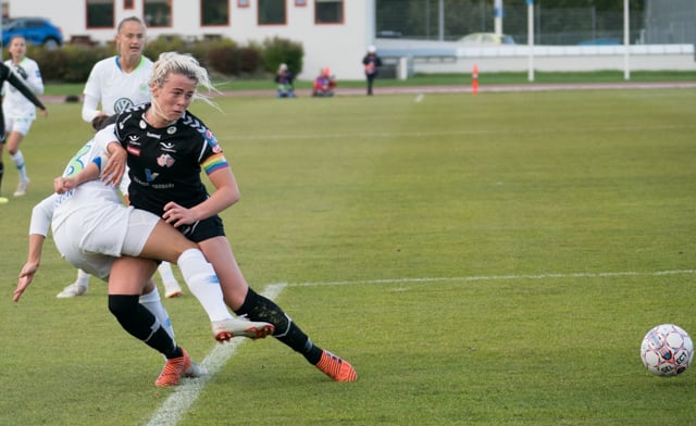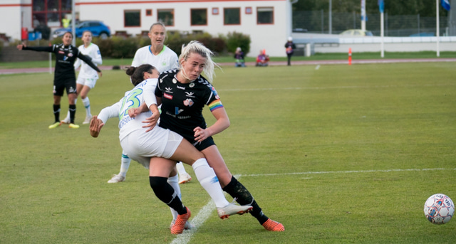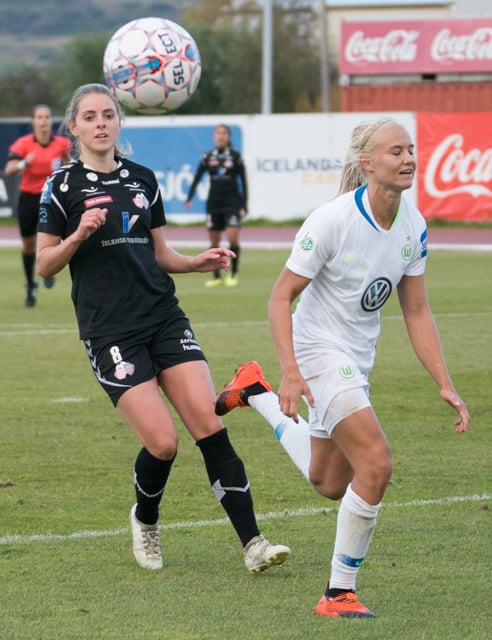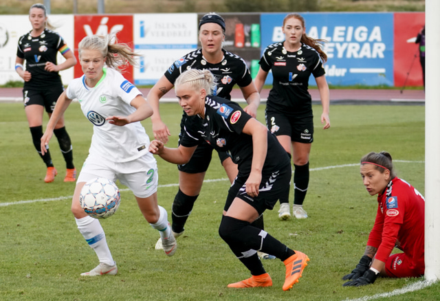 Úff! Þór/KA var í færi en Wolfsburg hreinsaði og Ewa Pajor geystist upp allan völlinn, endaði á skoti sem Þór náði að komast fyrir. Hún er öskufljót!