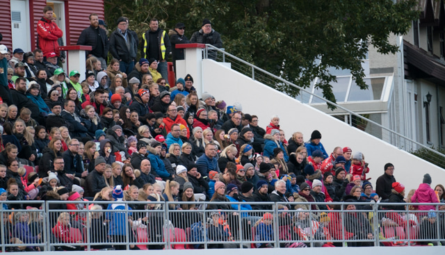 Það er fínasta mæting og full stúka, 1529 manns á vellinum. Hefði viljað sjá töluna fara upp í 2000 samt!