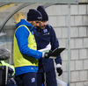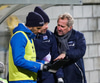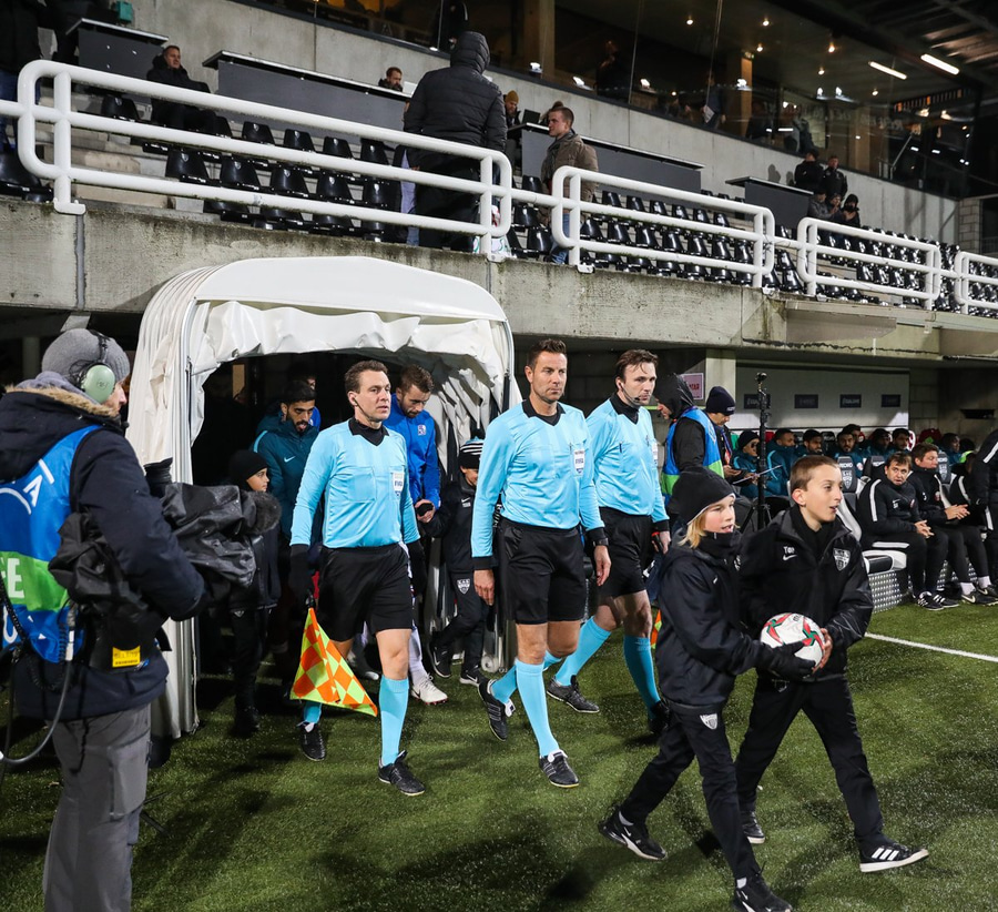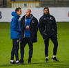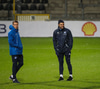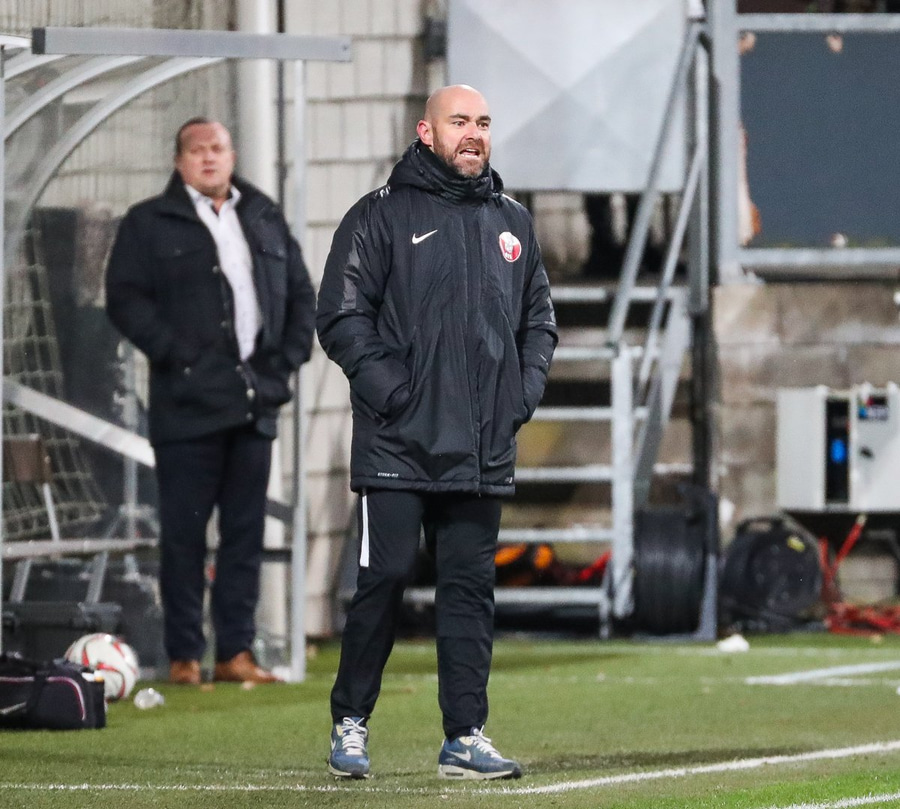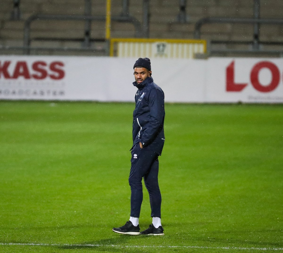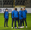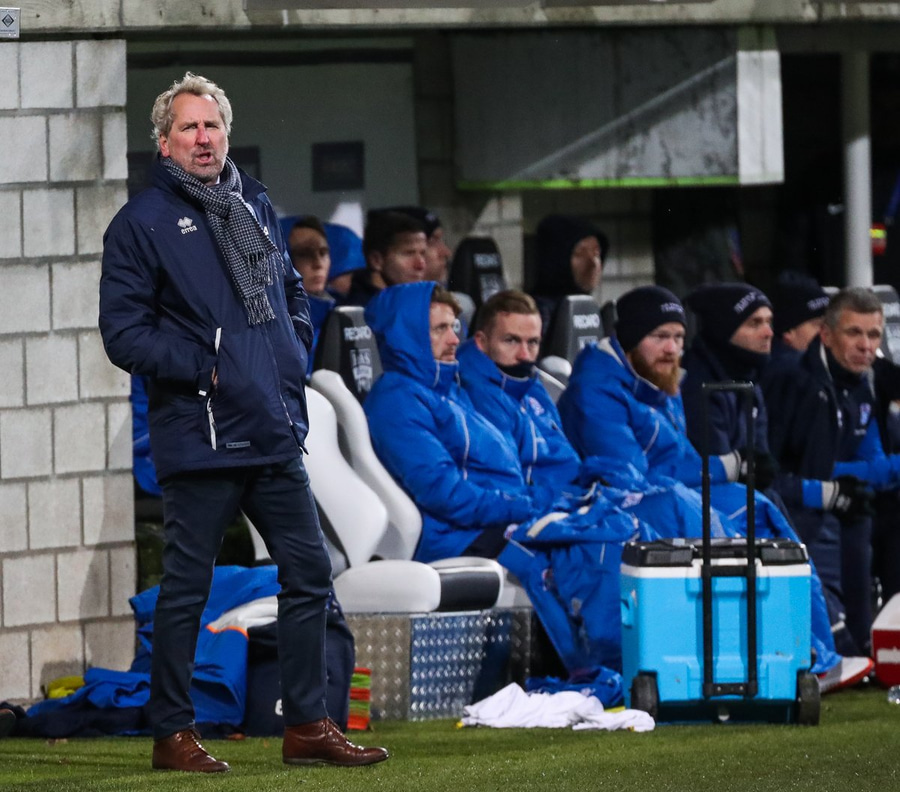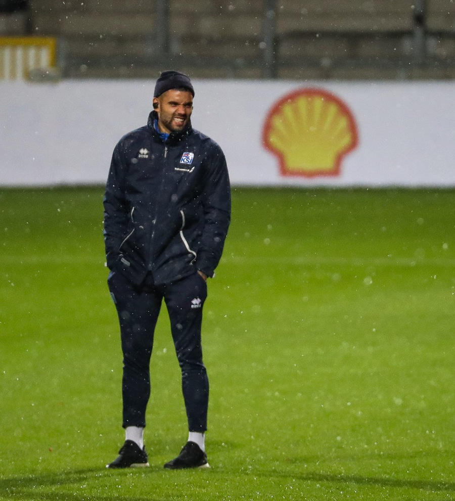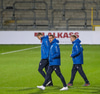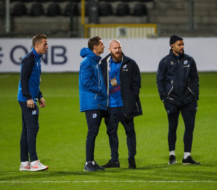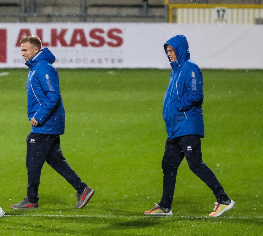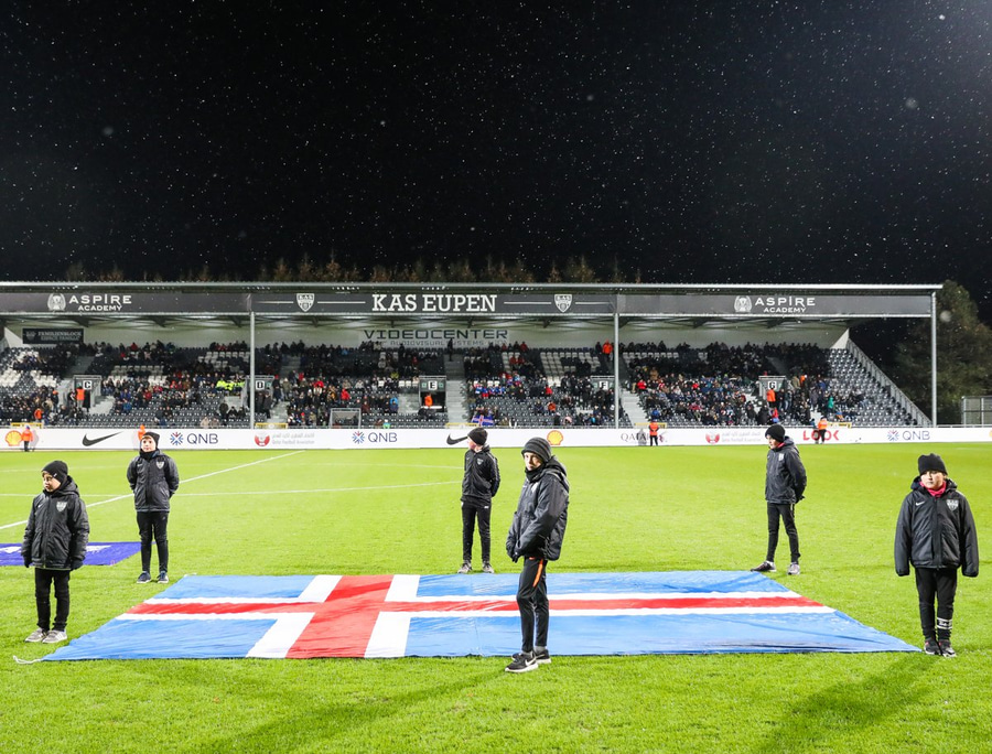 Það er kalt í Eupen og um tveggja gráðu hiti nú þegar styttist í leikinn. Leikflöturinn sjálfur er ansi lítill og þurfa innköstin ekki að vera mjög löng til að koma knettinum inn í teiginn! Við erum mættir á völlinn og bíðum nú bara eftir því að fá upplýsingar um byrjunarlið okkar manna.