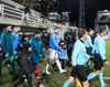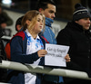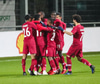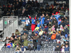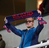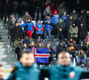 Hópur ungra áhorfenda, strákar í yngri flokkum KAS Eupen, taka Víkingaklappið í stúkunni.