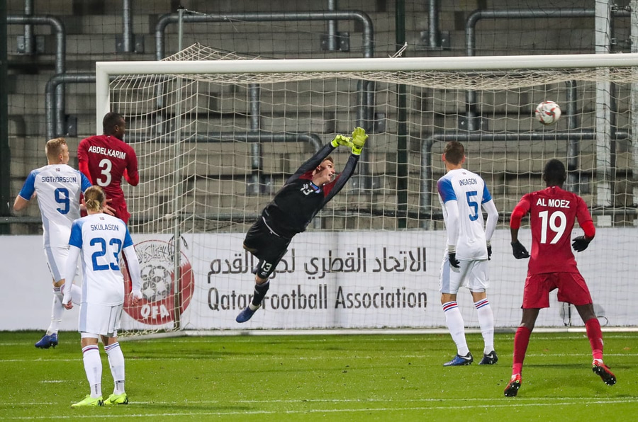 Hörður Björgvin með langa hættulega sendingu. Markvörður Katar í vandræðum en kemur boltanum í innkast. Eftir innkastið kemur svo fyrirgjöf sem hann grípur.