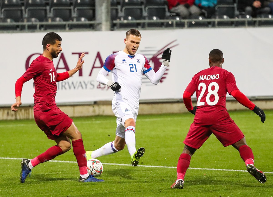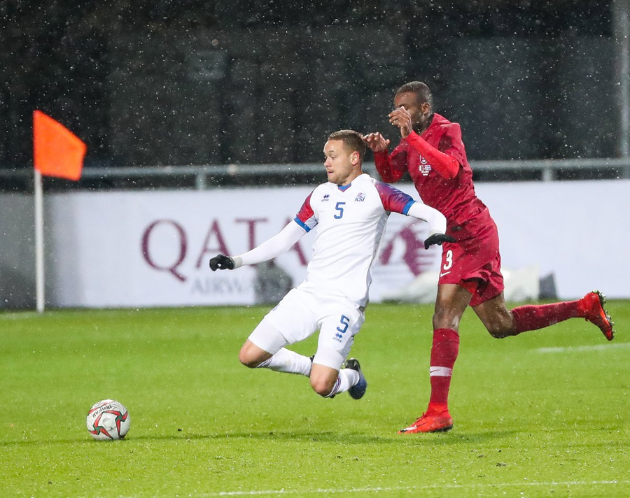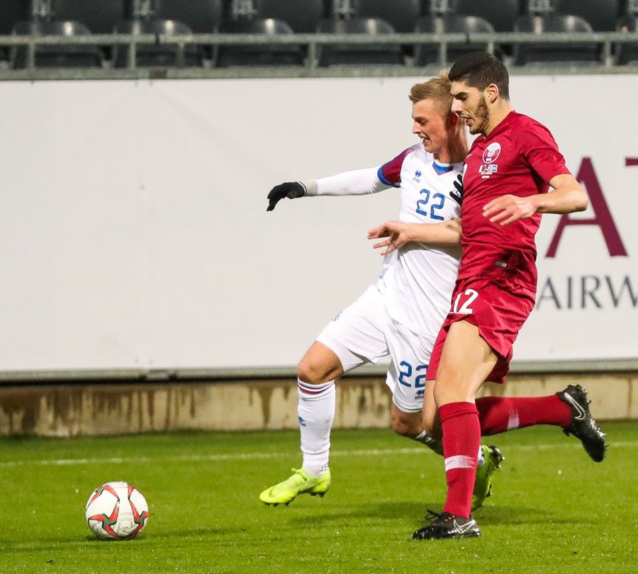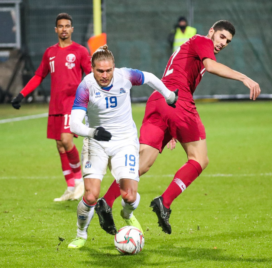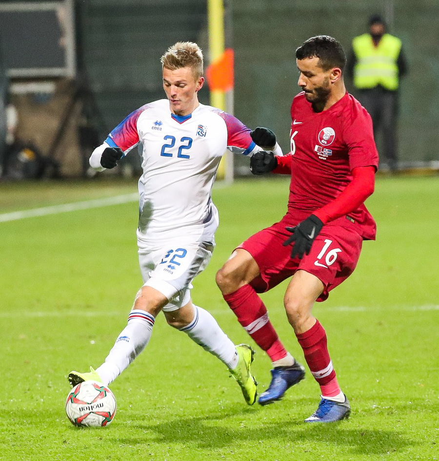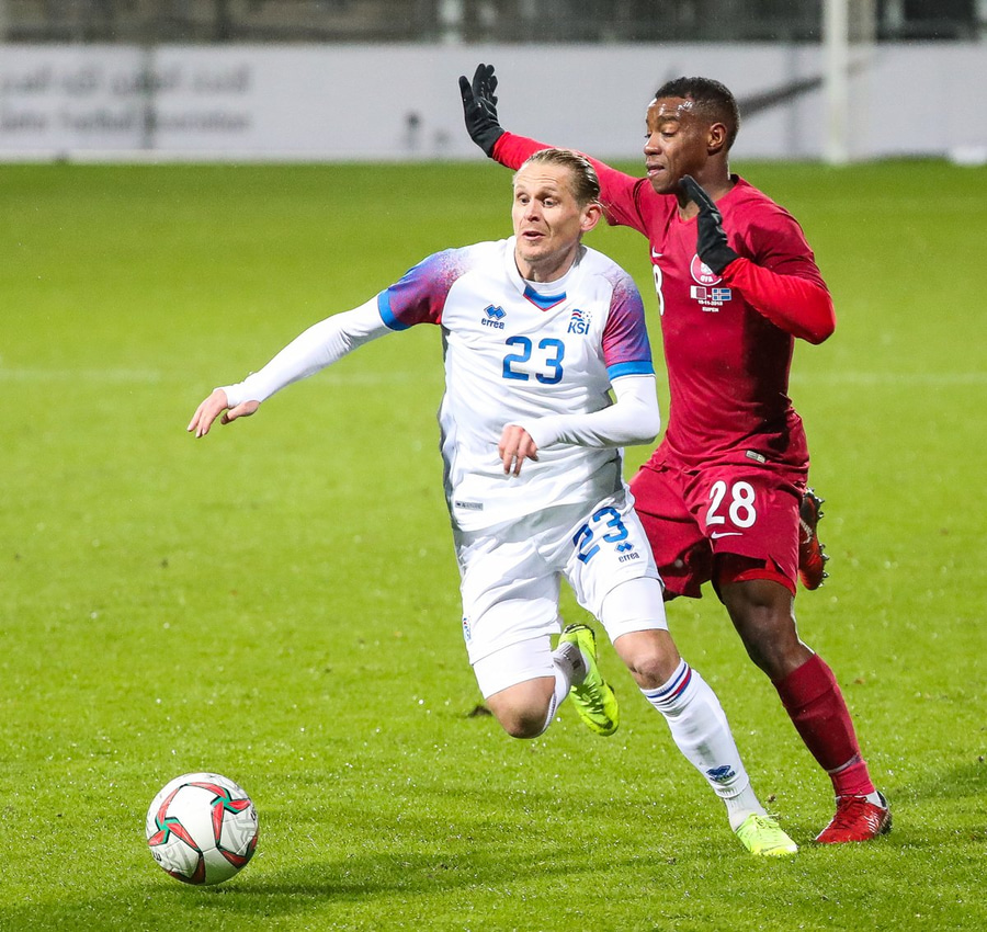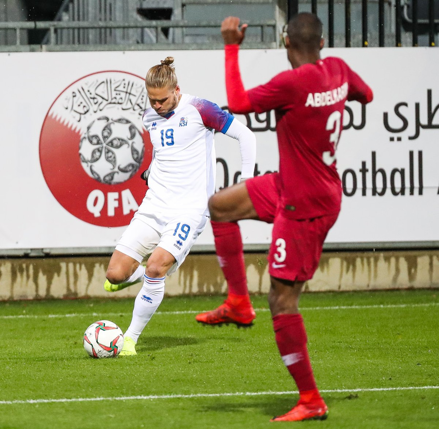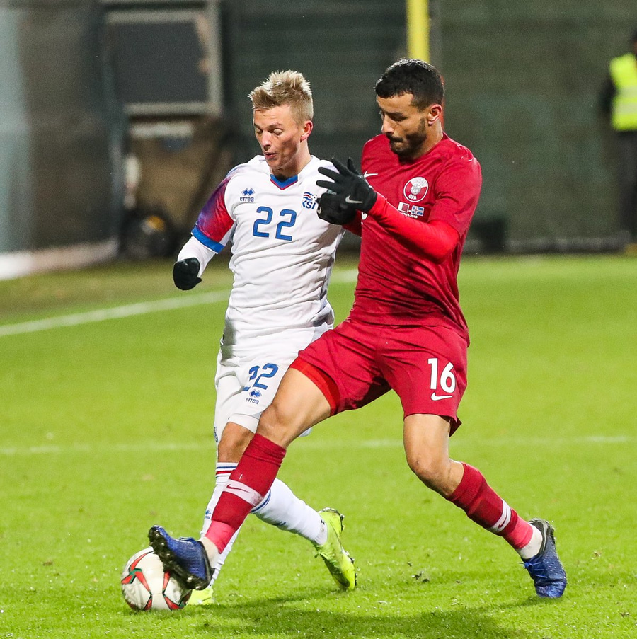 Andri Rúnar krækir í aukaspyrnu á miðjum vallarhelmingi Katar.