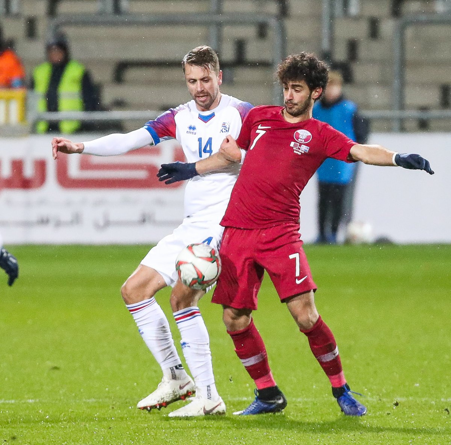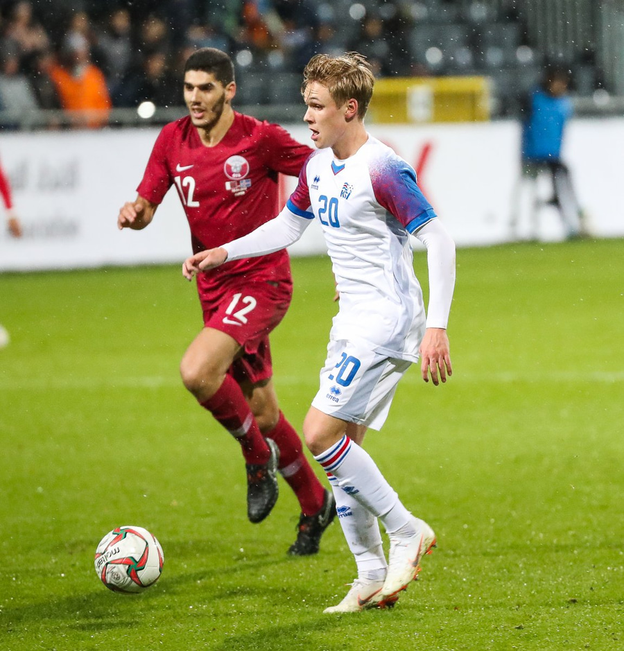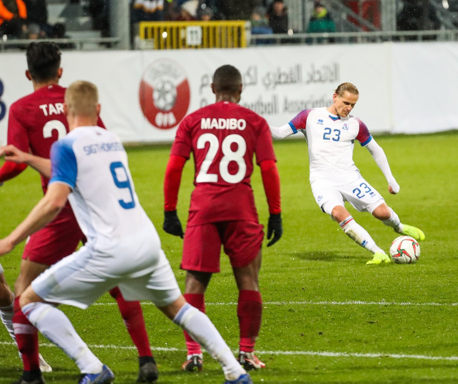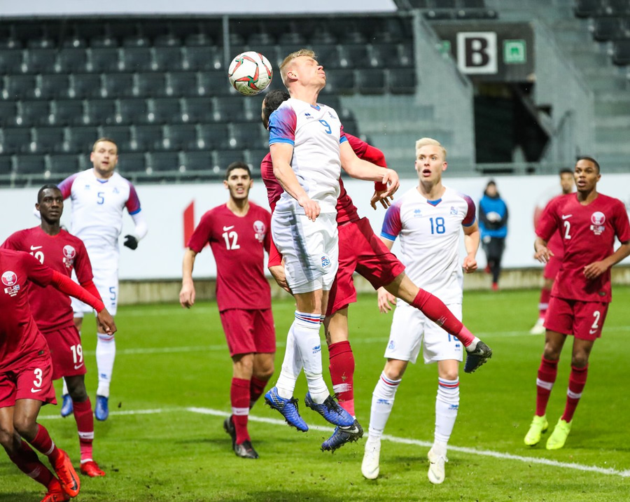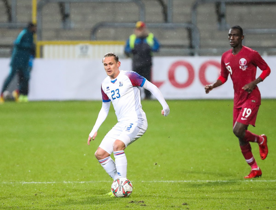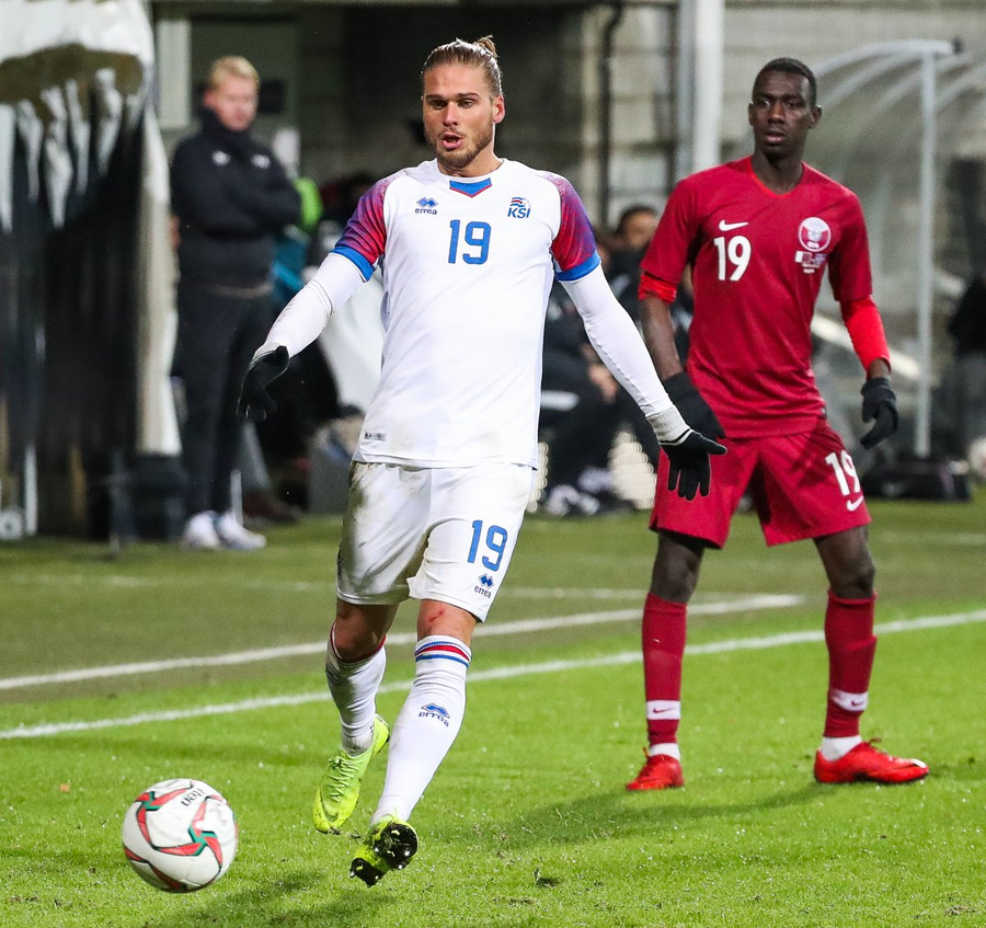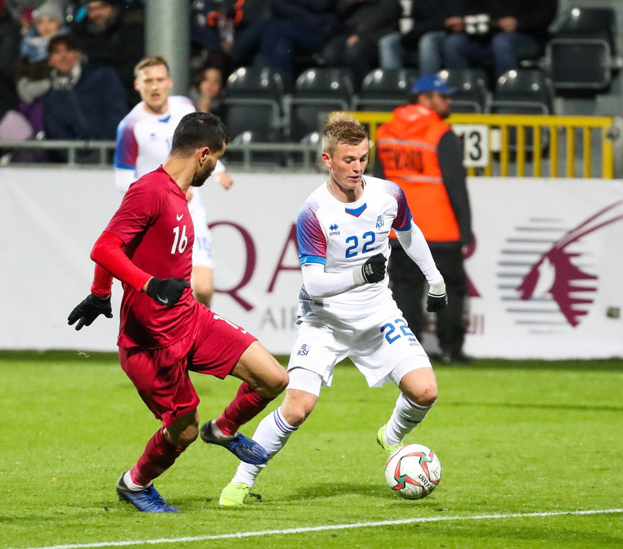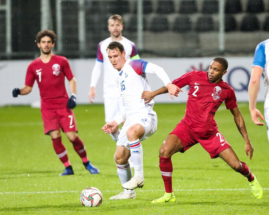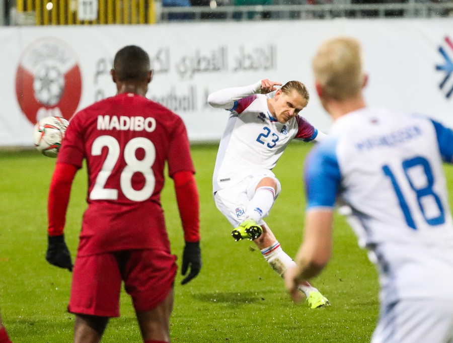 Andri Rúnar krækir í aukaspyrnu á miðjum vallarhelmingi Katar.