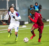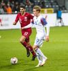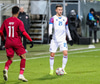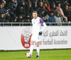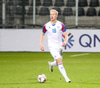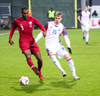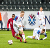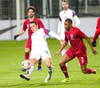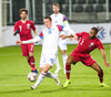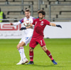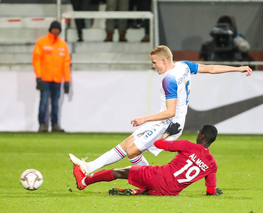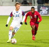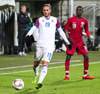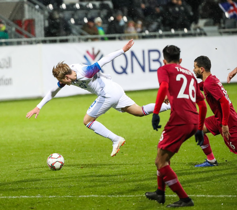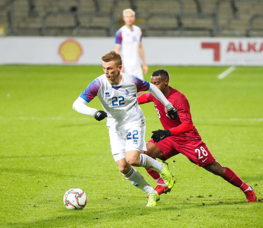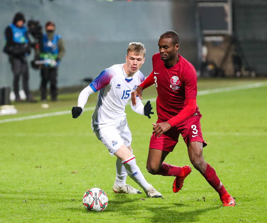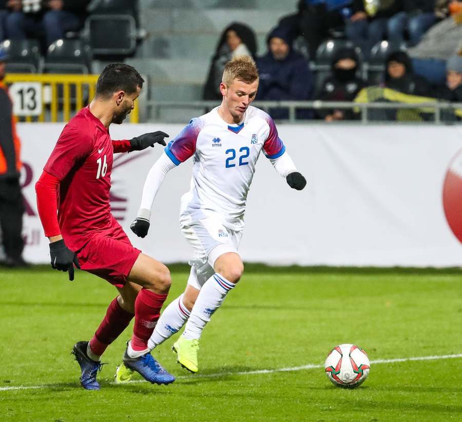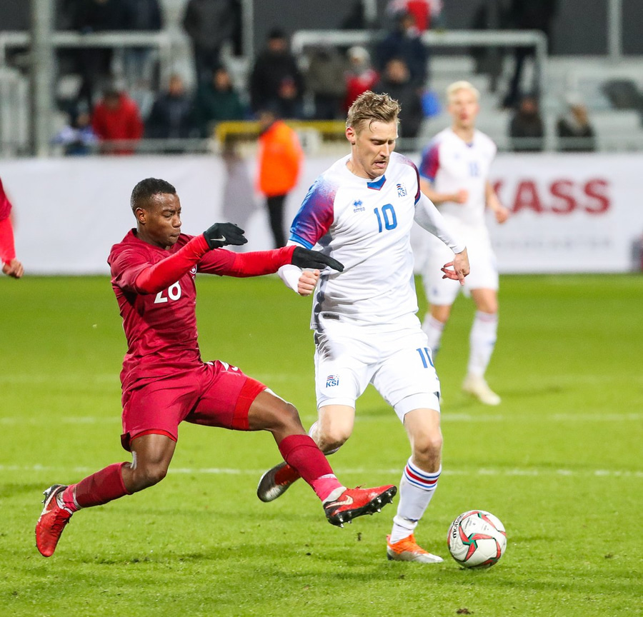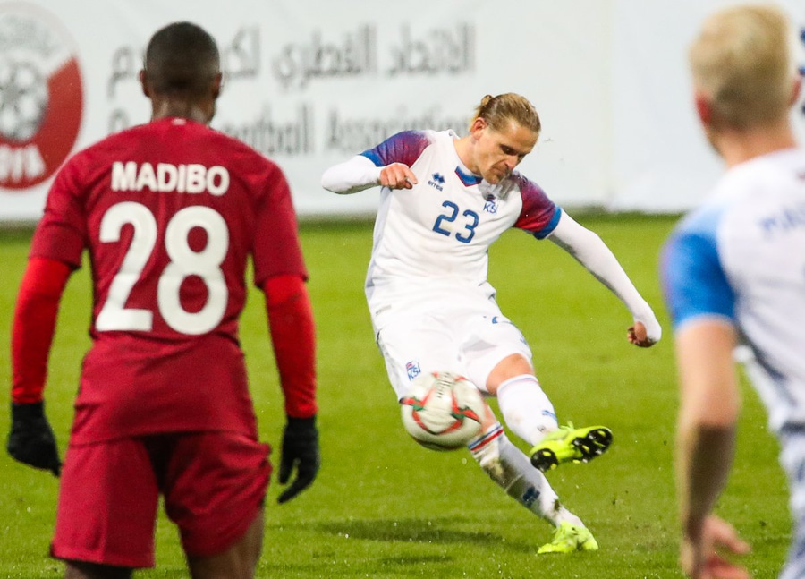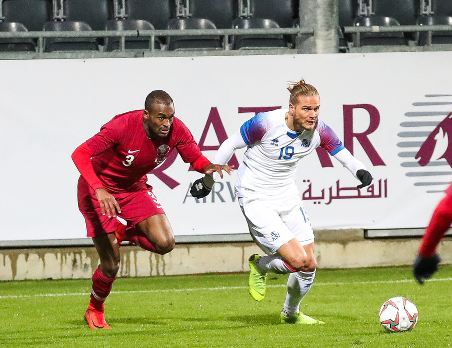 Andri Rúnar krækir í aukaspyrnu á miðjum vallarhelmingi Katar.