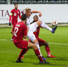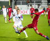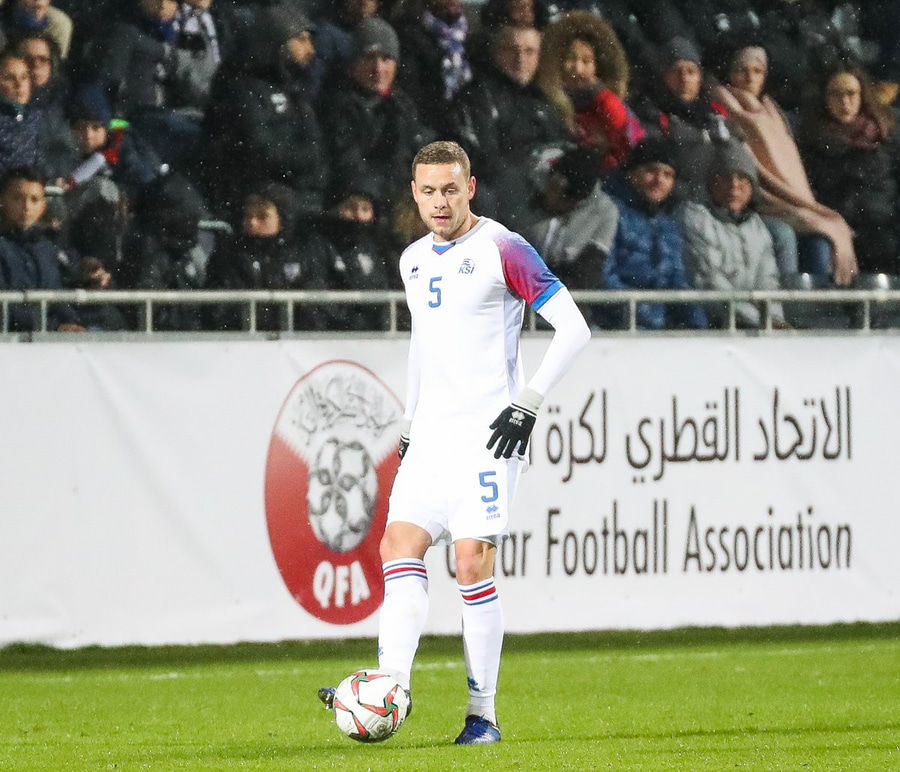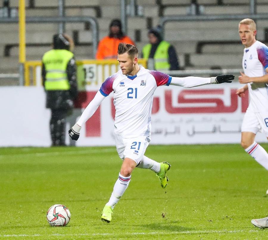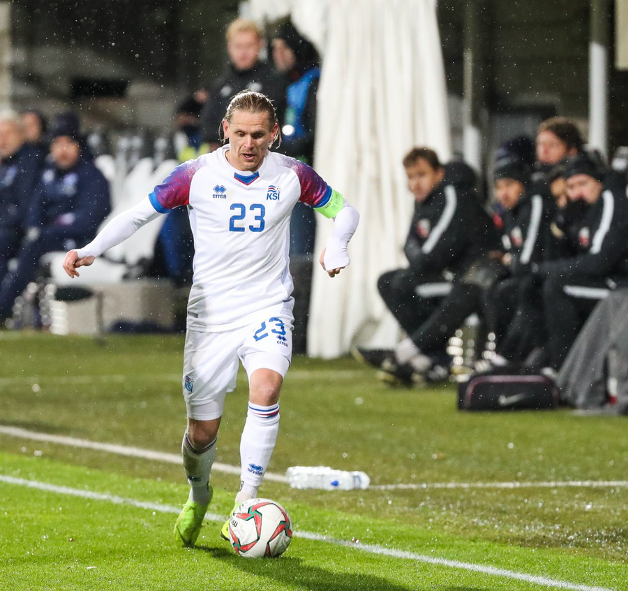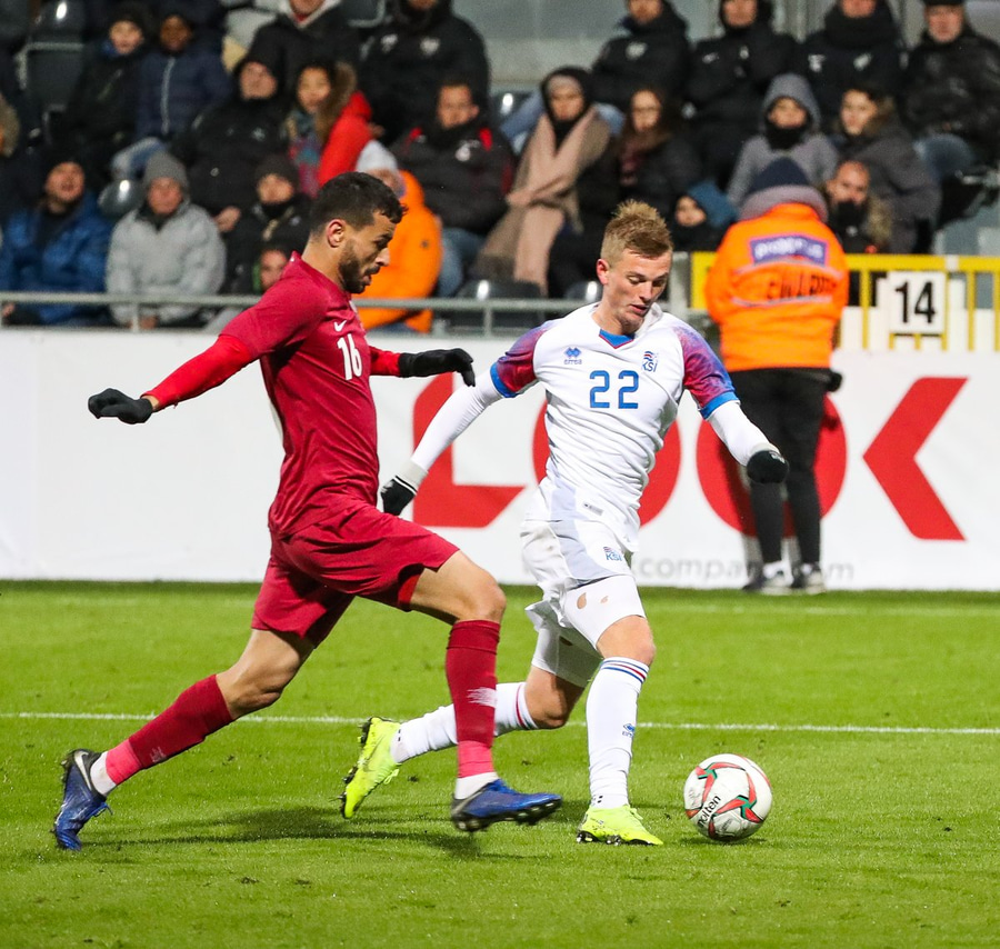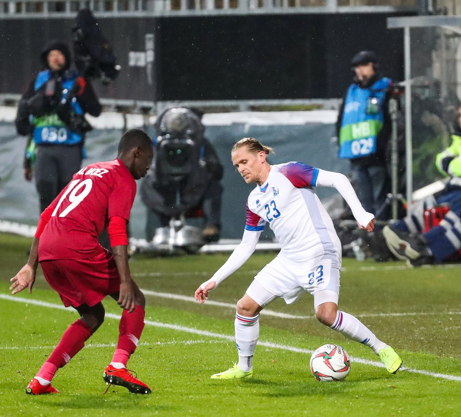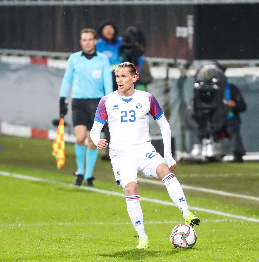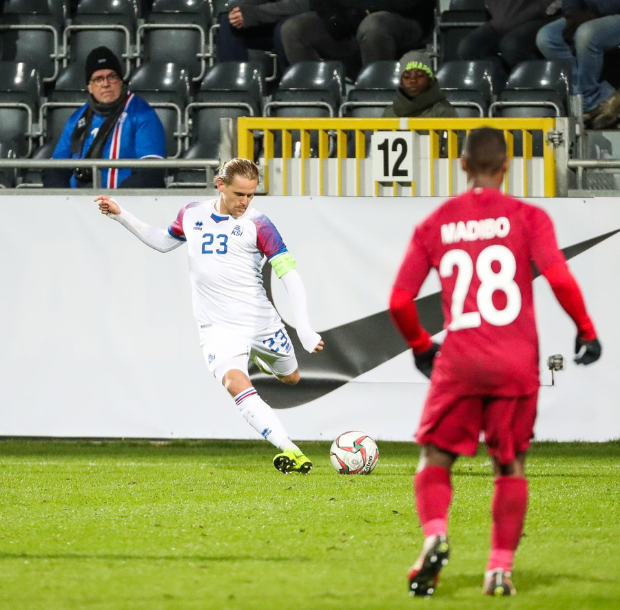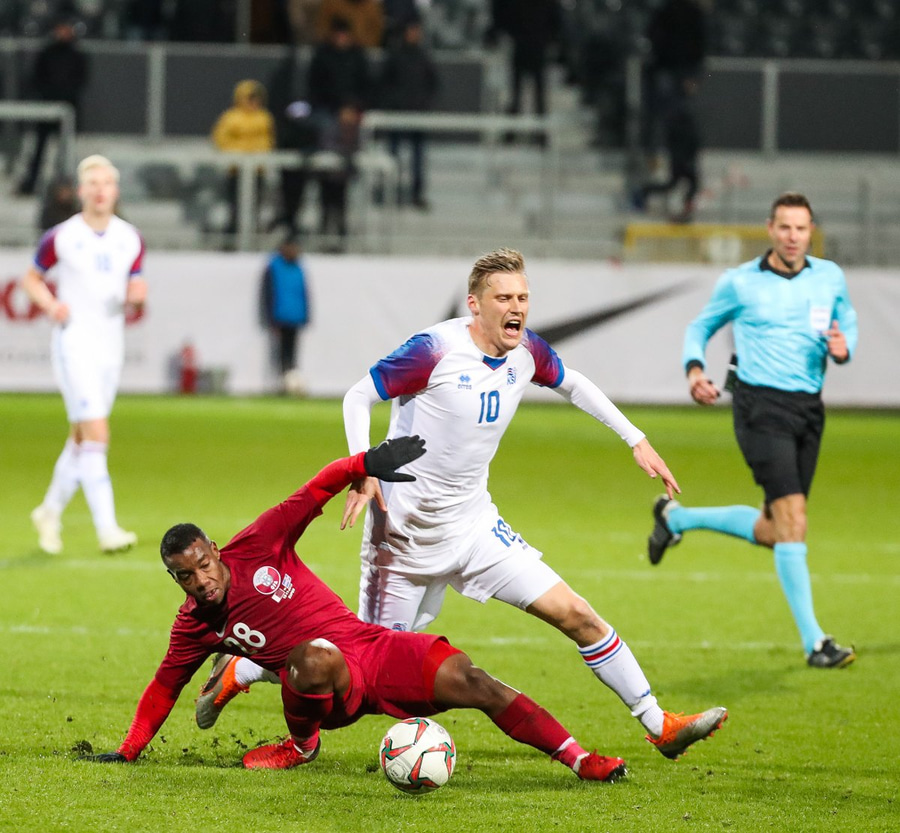 Rúrik Gíslason með fyrirgjöf frá hægri, Arnór nálægt því að ná til boltans en Katari skallar í innkast. Efir langt innkast frá Herði vinnur Ísland svo hornspyrnu.