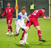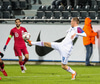 Arnór Ingvi reynir skot fyrir utan teig, fast er það en vel yfir.