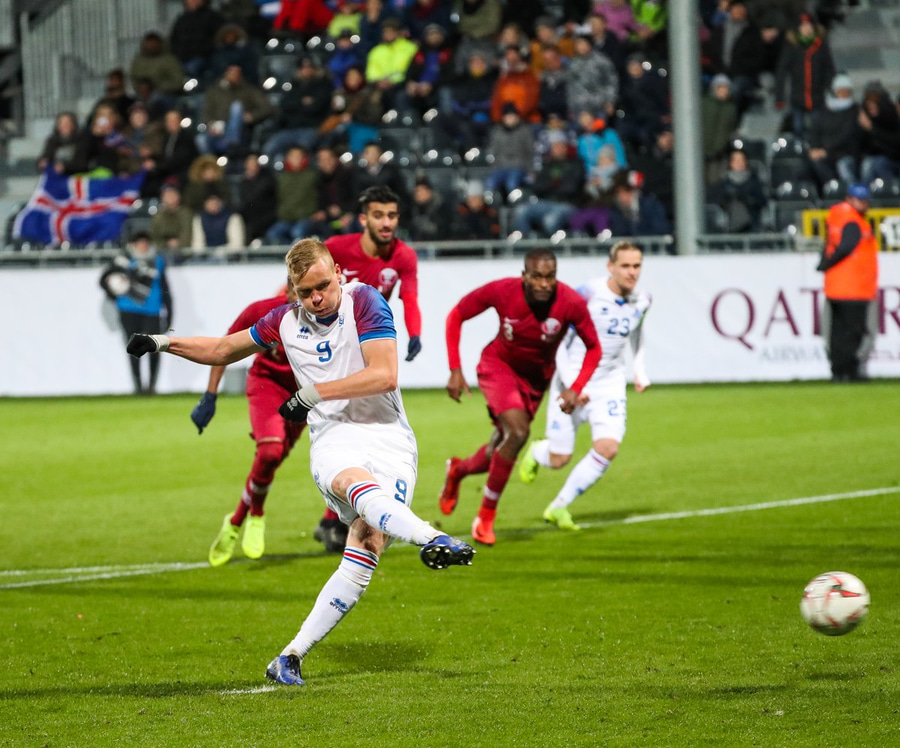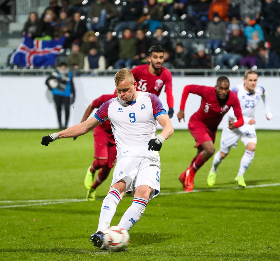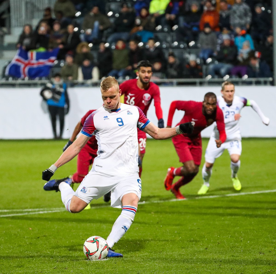 VÍTI ISLAND FÆR VÍTI!!! Hendi á leikmann Katar. Hjörtur sparkaði boltanum upp í hendi Katarans beint fyrir framan nef dómarans. Kolbeinn tekur spyrnuna.