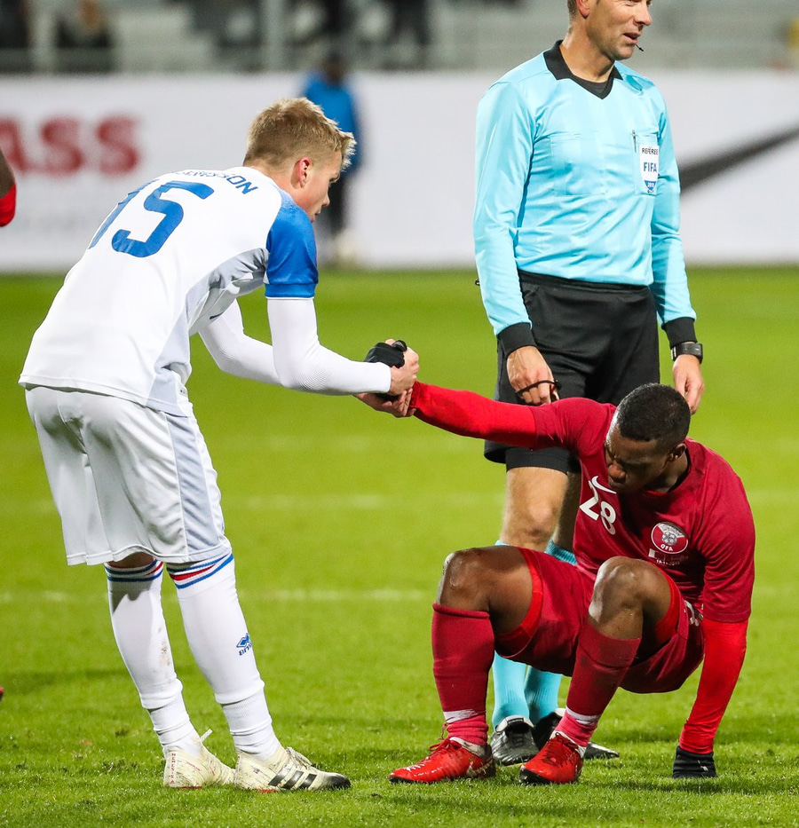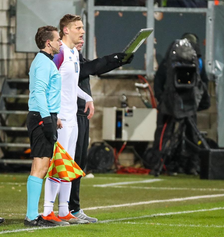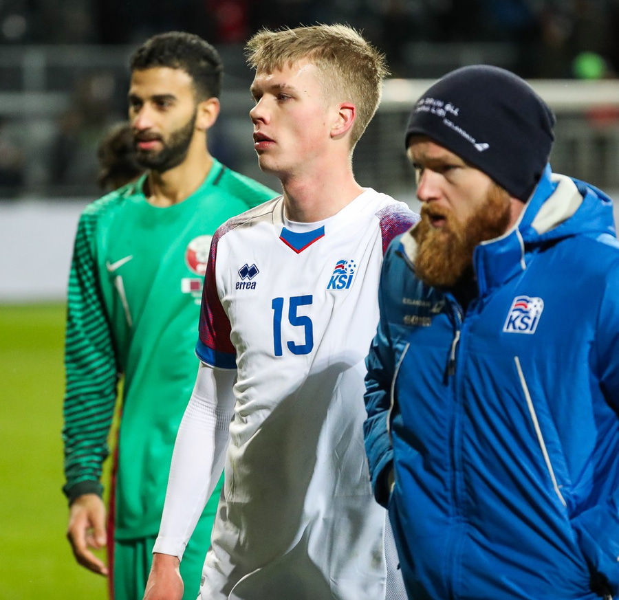 Brotið á Arnóri Sig við miðlínuna. Einhver Katari með bögg og stendur fyrir knettinum. Arnór ýtir honum bara í burtu og kemur boltanum í spil. Hollenski dómarinn horfir reiður á Katarann og bendir á hann.