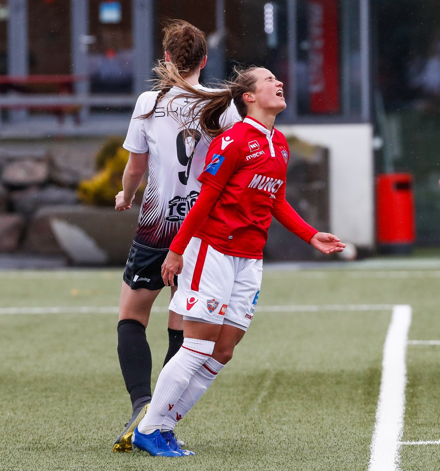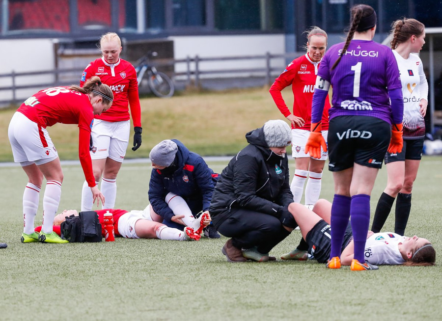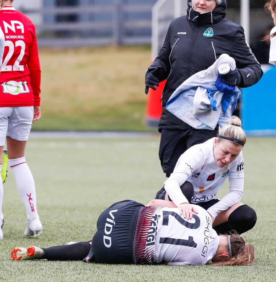 Fyrir brot á Hildi en hann lét leikinn halda áfram. Þetta var ekki falleg tækling og skall Hildur með andlitið beint í gervigrasið.