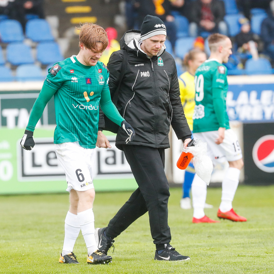 Alexander Helgi liggur á vellinum eftir klafs og þarf aðhlynningu en virðist vera í lagi.