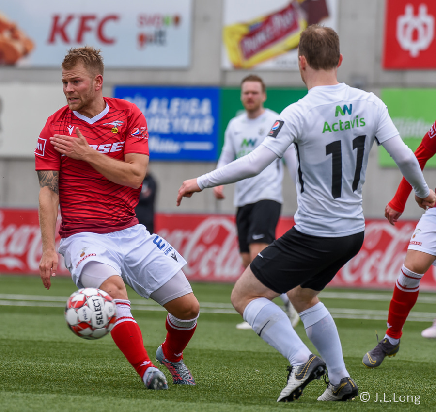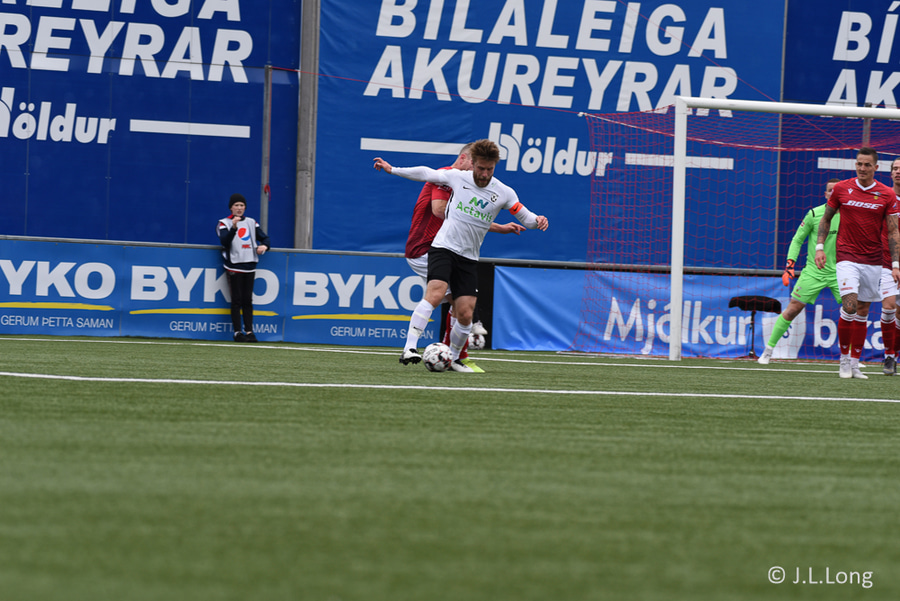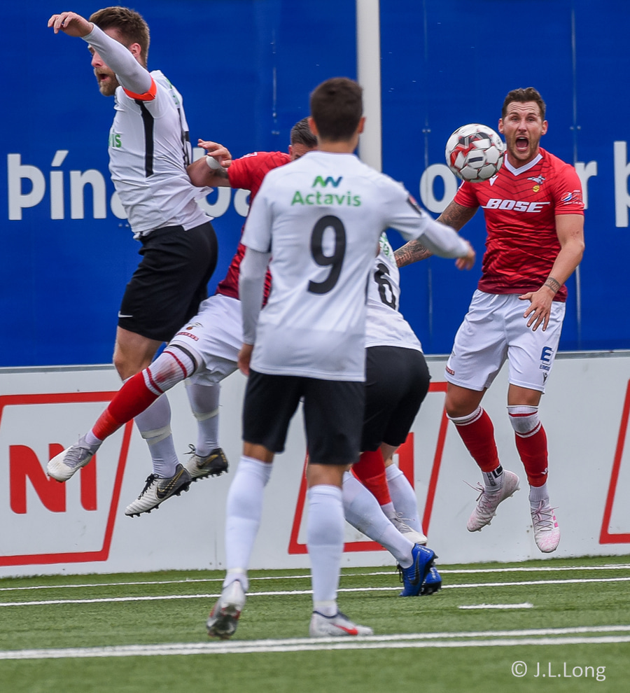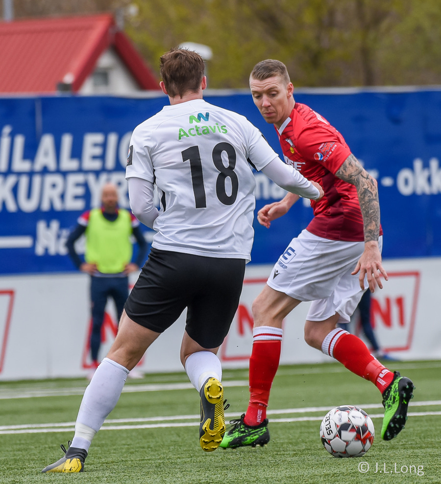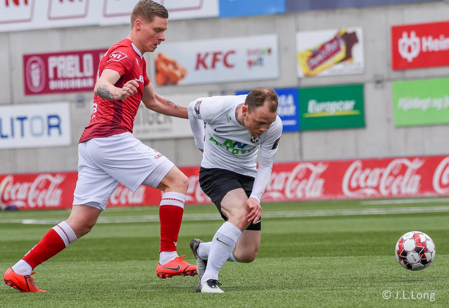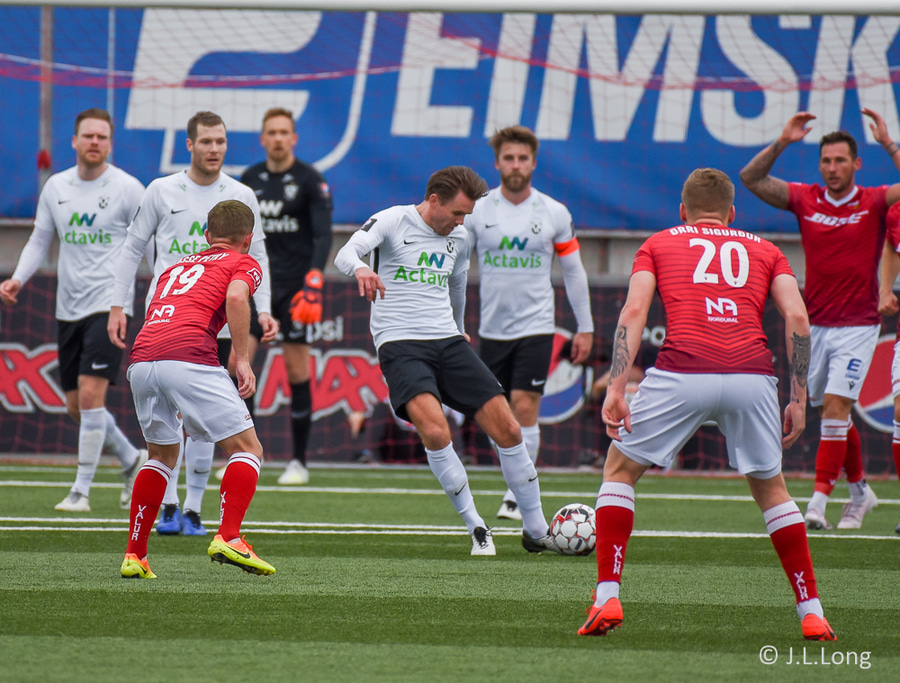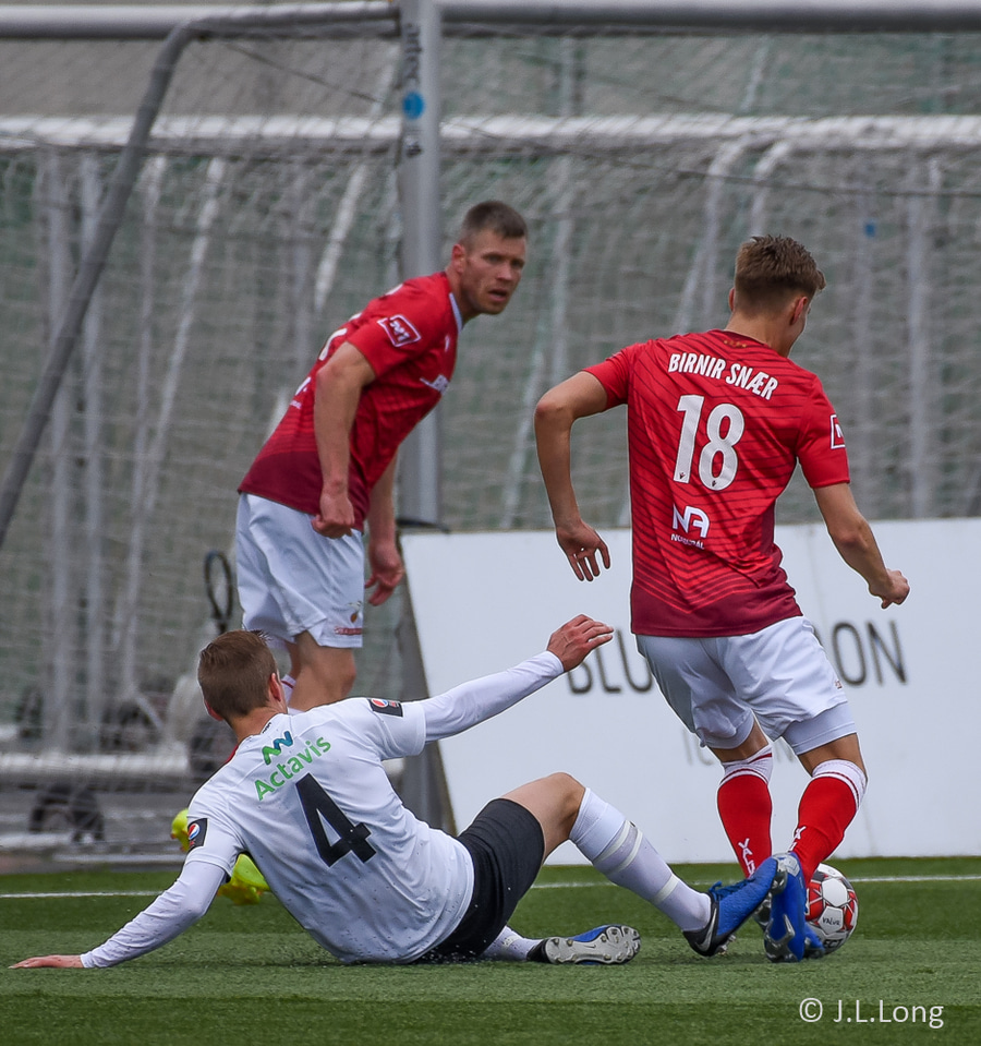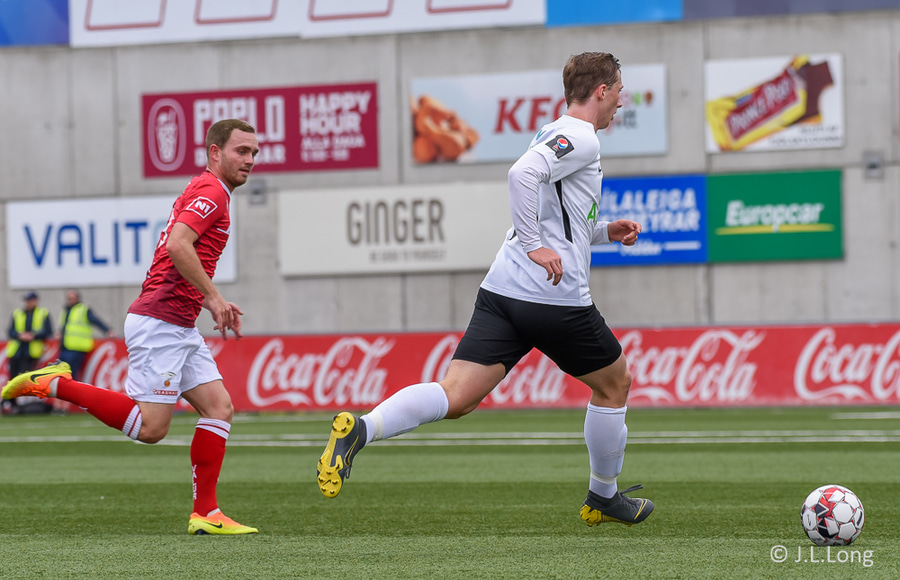 Björn Daníel fer hér upp vinstri kantinn og nær góðri fyrirgjöf á Jákup en skalli hans fer framhjá markinu.