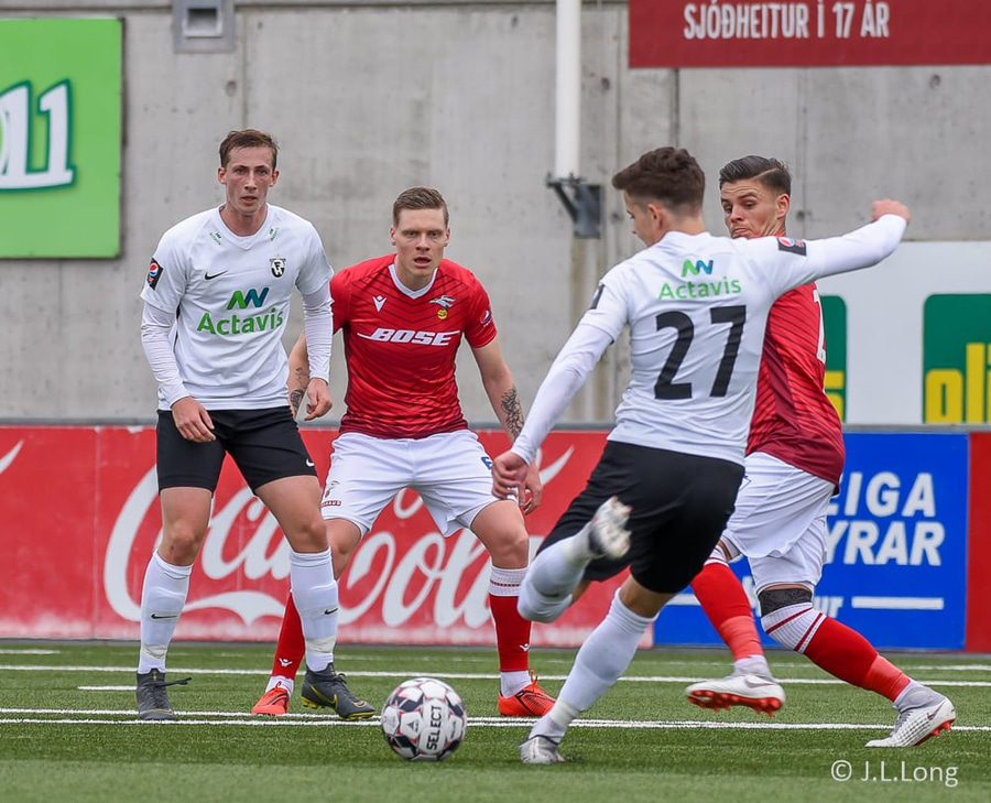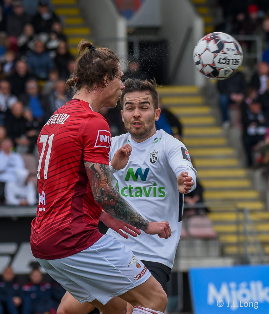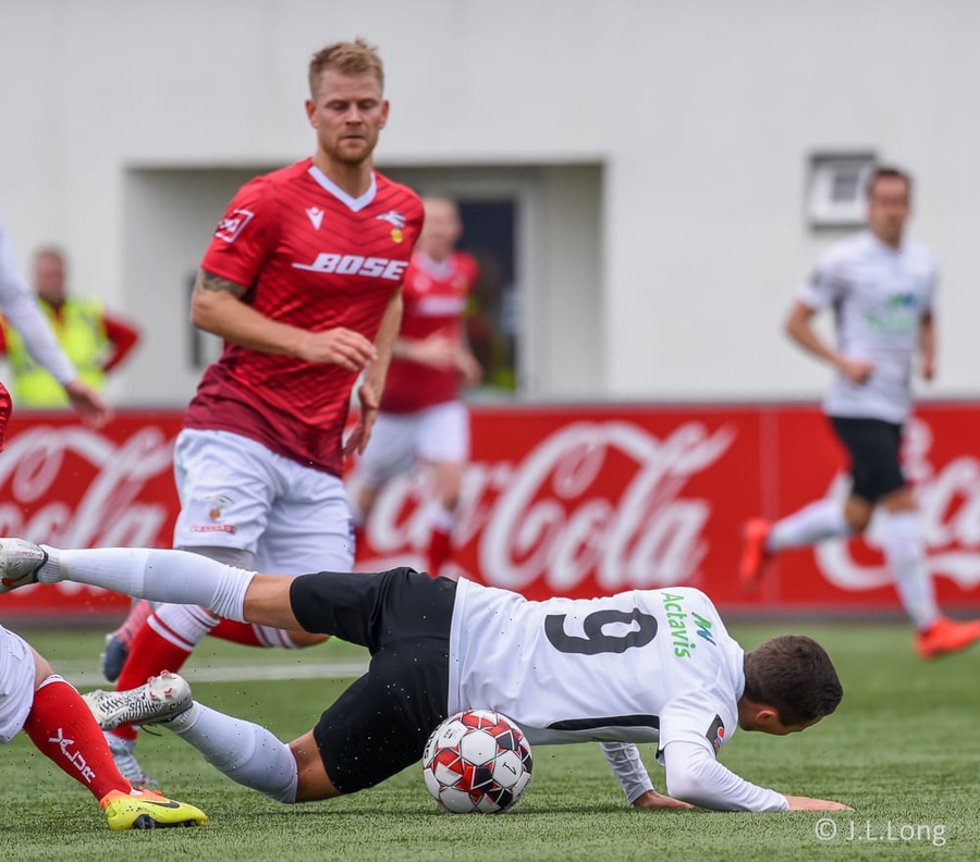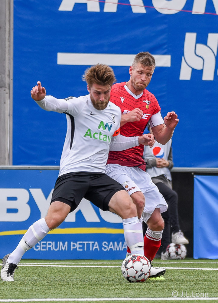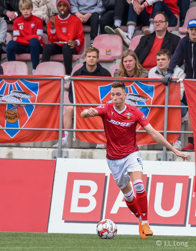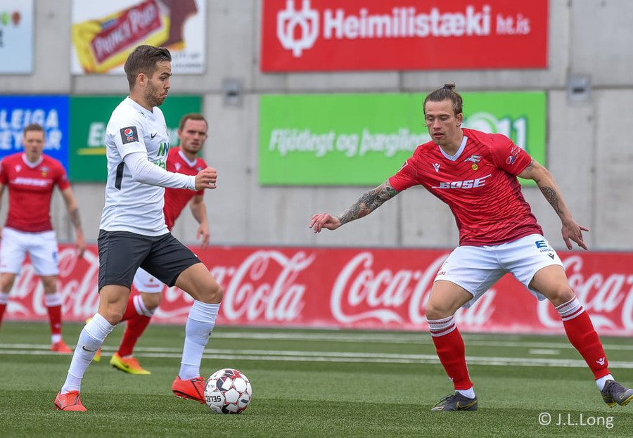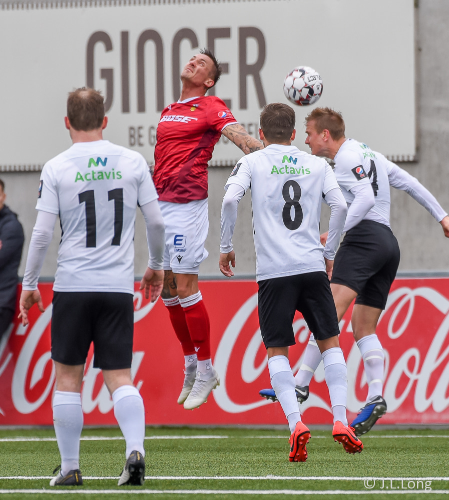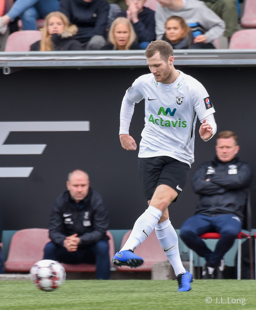 Björn Daníel fer hér upp vinstri kantinn og nær góðri fyrirgjöf á Jákup en skalli hans fer framhjá markinu.