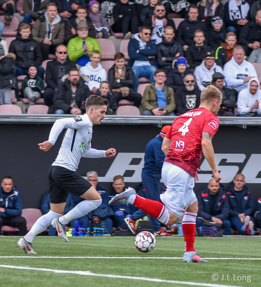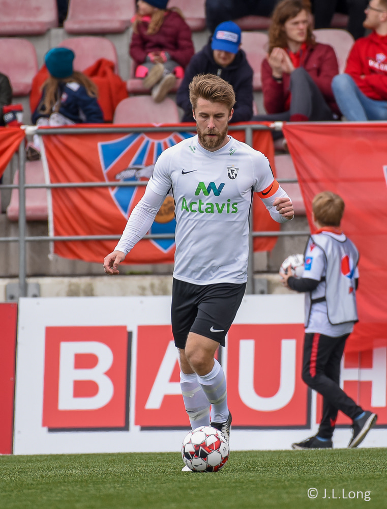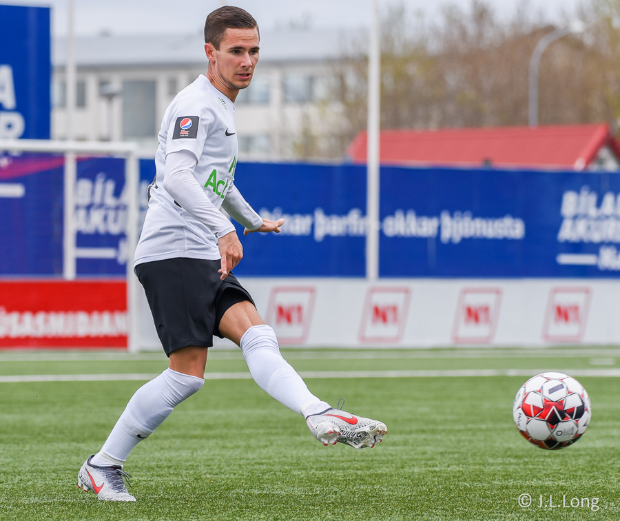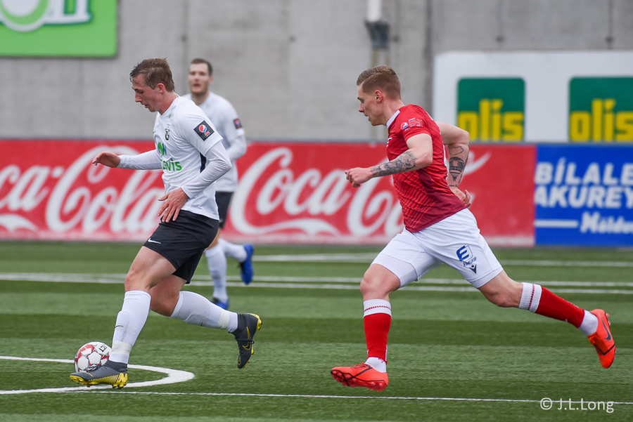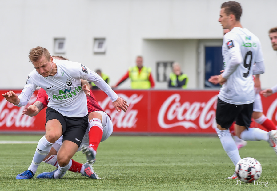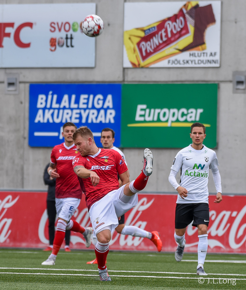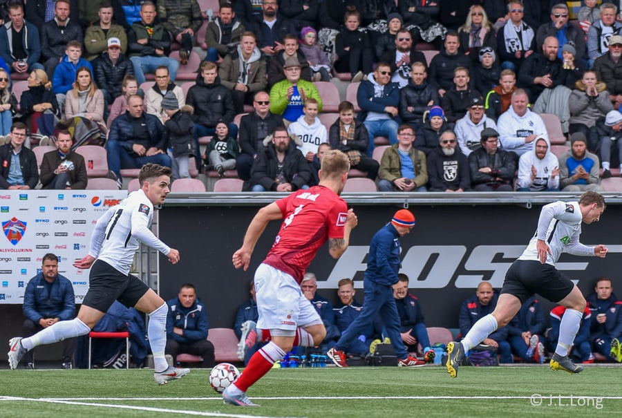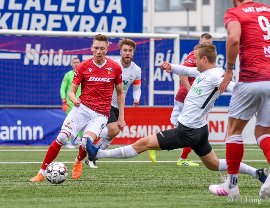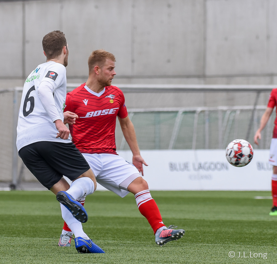 Björn Daníel fer hér upp vinstri kantinn og nær góðri fyrirgjöf á Jákup en skalli hans fer framhjá markinu.