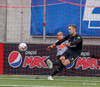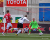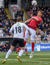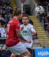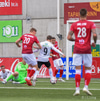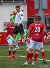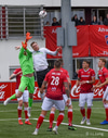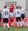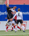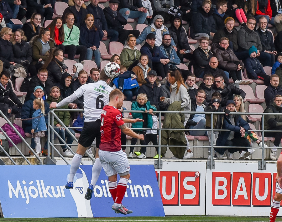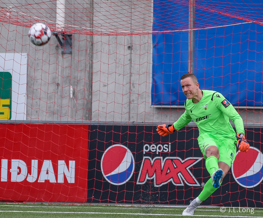 Bjarni skallar að marki eftir hornið en skallinn er beint á Gunna sem grípur boltann.