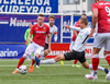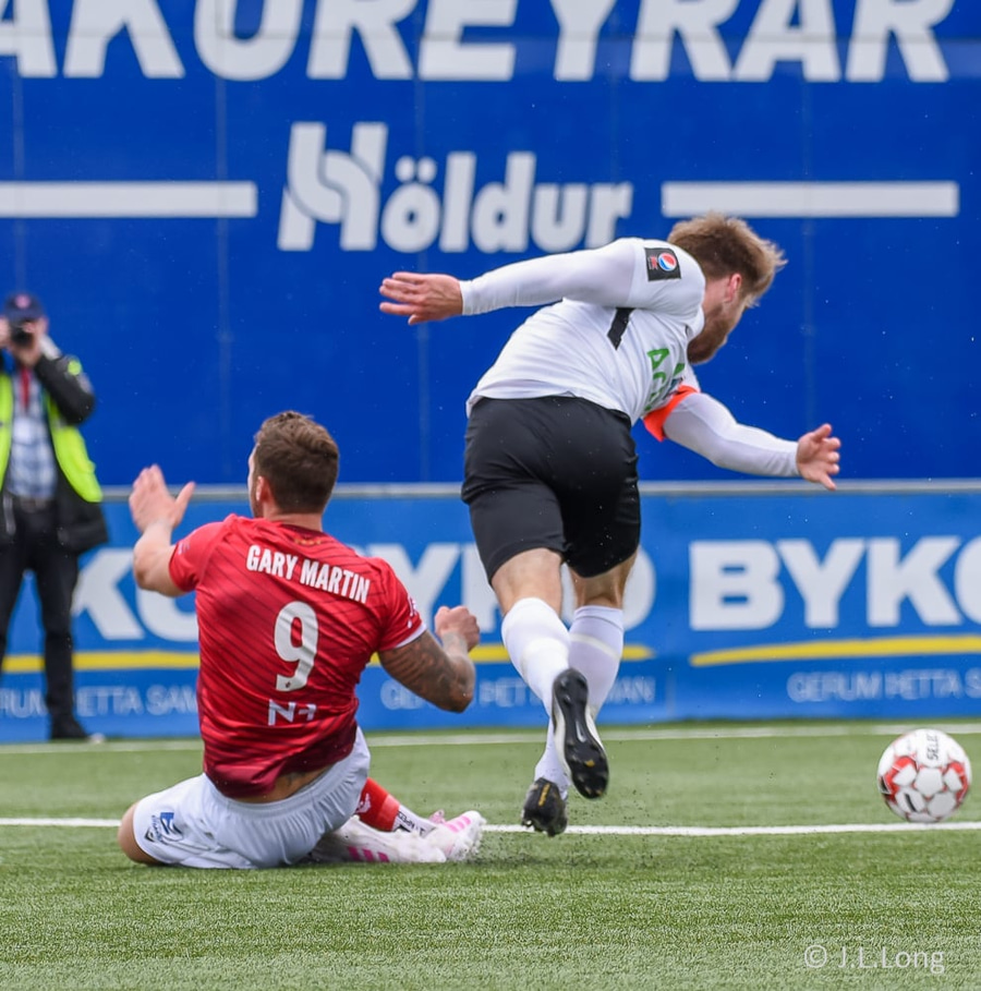 Gary Martin kemst í boltann hérna en nær ekki valdi af honum, heimtar víti en Gunni kemur aldrei við hann!