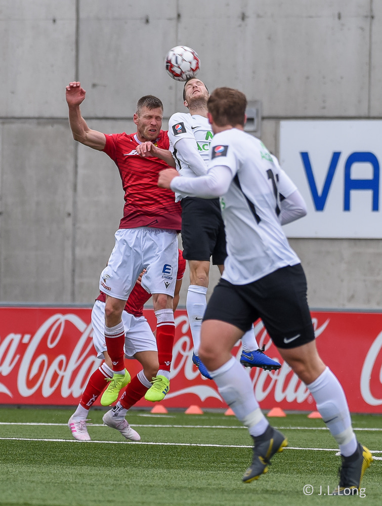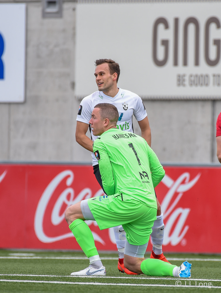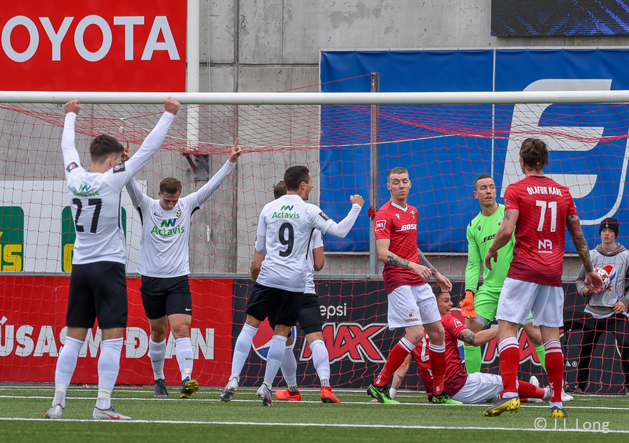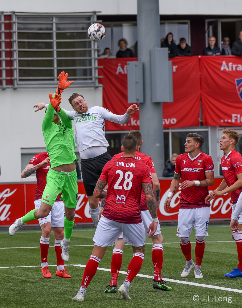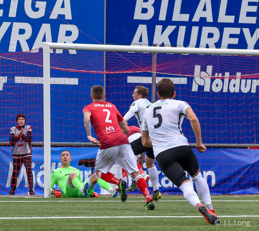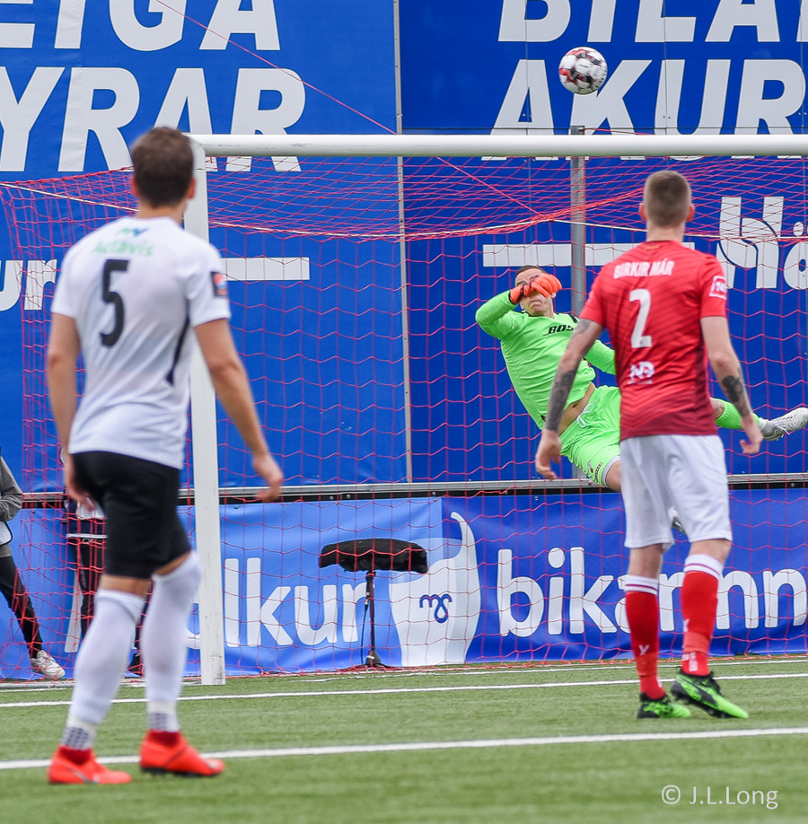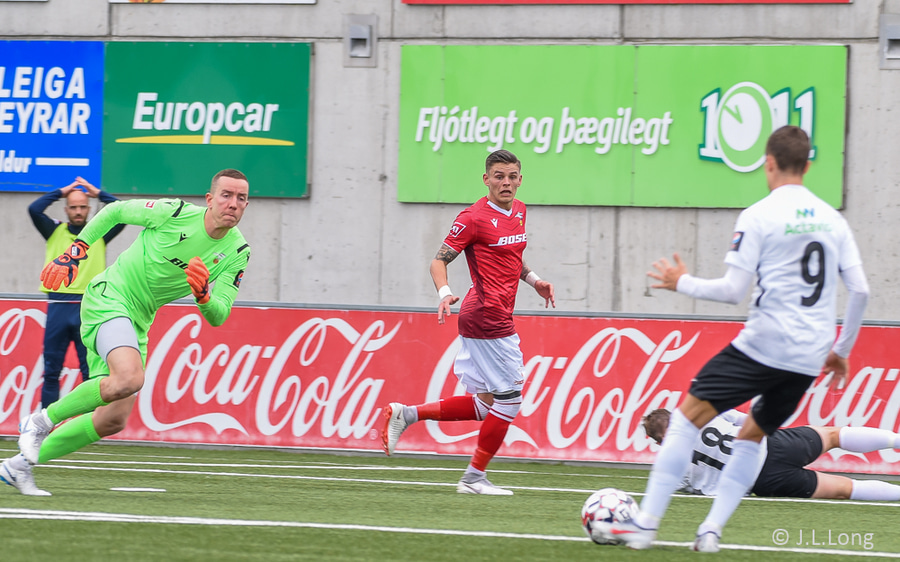 Jákup galopin í gegn og Jónatan kemur með sendinguna, Birkir nær hins vegar að bjarga því, Jákup snéri baki í sendinguna, hefði þurft að opna líkamann.