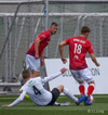 Brandur er sparkaður niður hérna af Birki, boltinn berst inn í teig og Hannes bjargar, þaðan fer boltinn á Jónatan með autt mark en touchið svíkur hann og Bjarni hreinsar af línunni.
