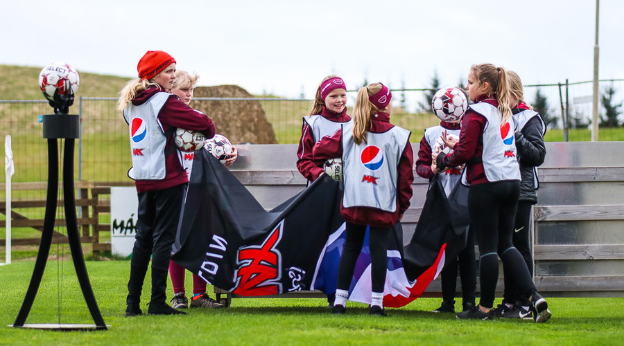 Guðmundur Karl, vallarþulur á JÁVERK-vellinum, kynnir hér liðin inn. Þetta er allt saman að bresta á.