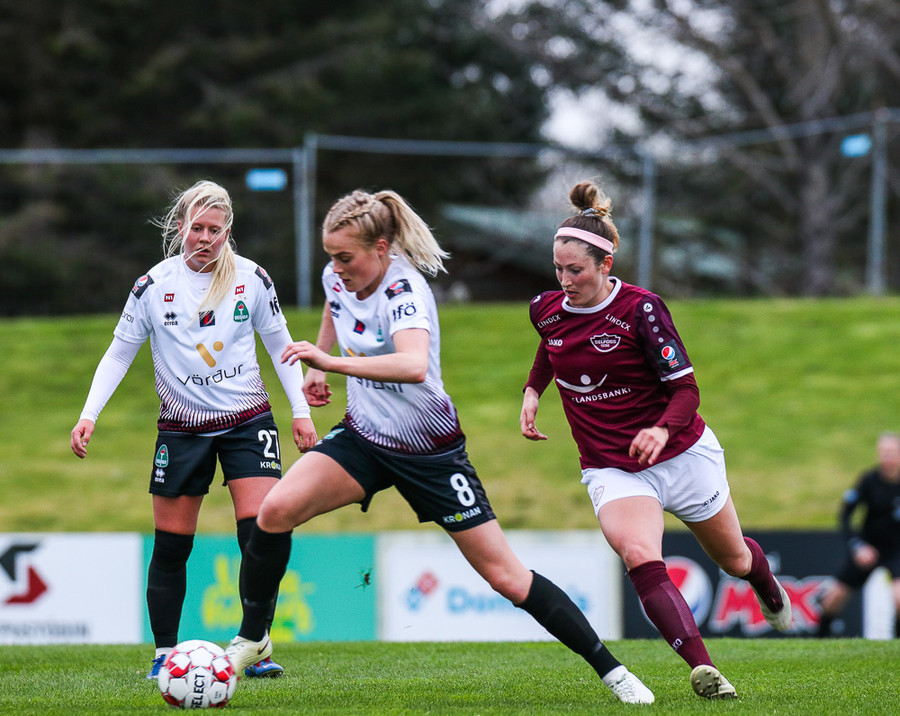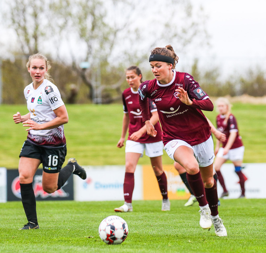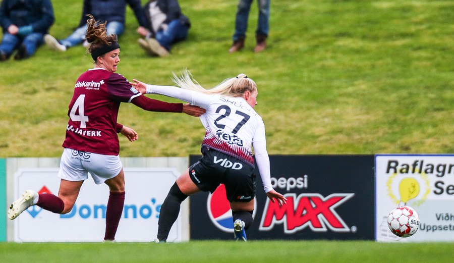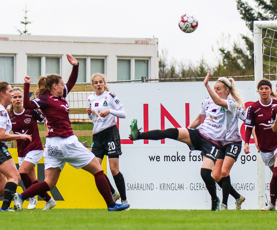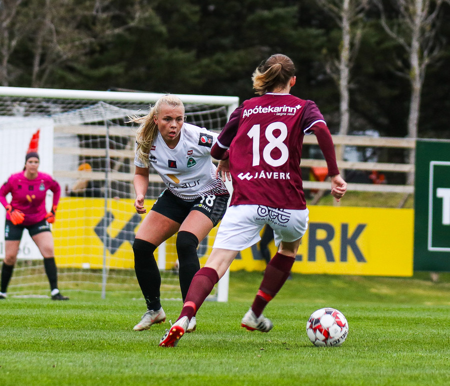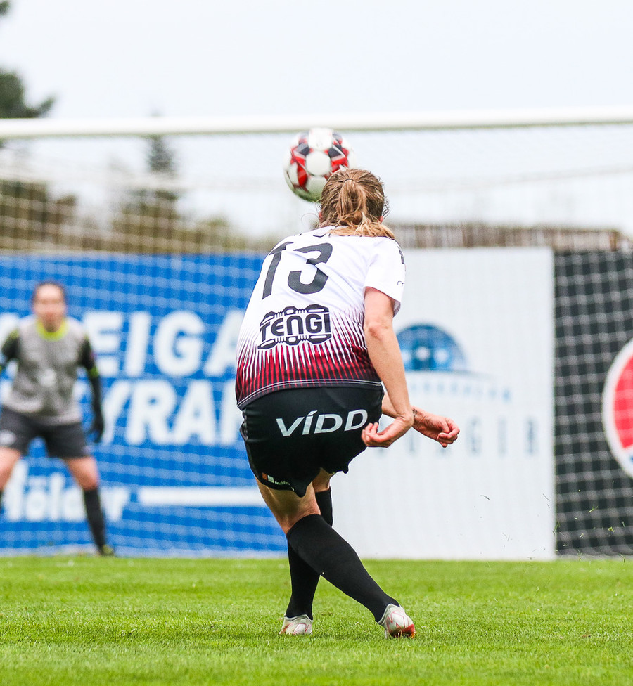 Hólmfríður Magnúsdóttir með misheppnað skot, langt framhjá. Fín tilraun en þessi var aldrei að fara að skapa neina hættu.