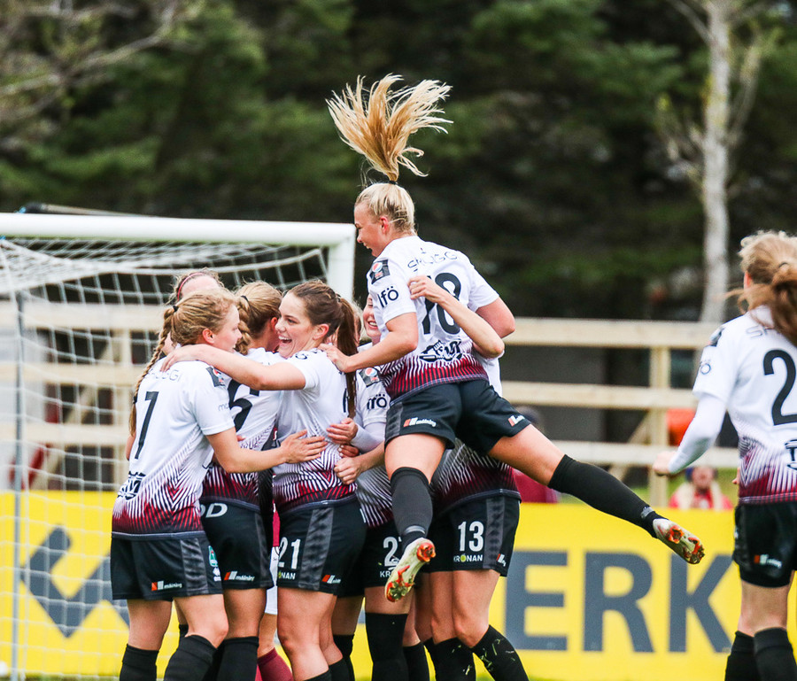 Þetta er komið af stað. Heimastúlkur hefja leik með boltann og sækja í átt að Stóra hólnum góða.
