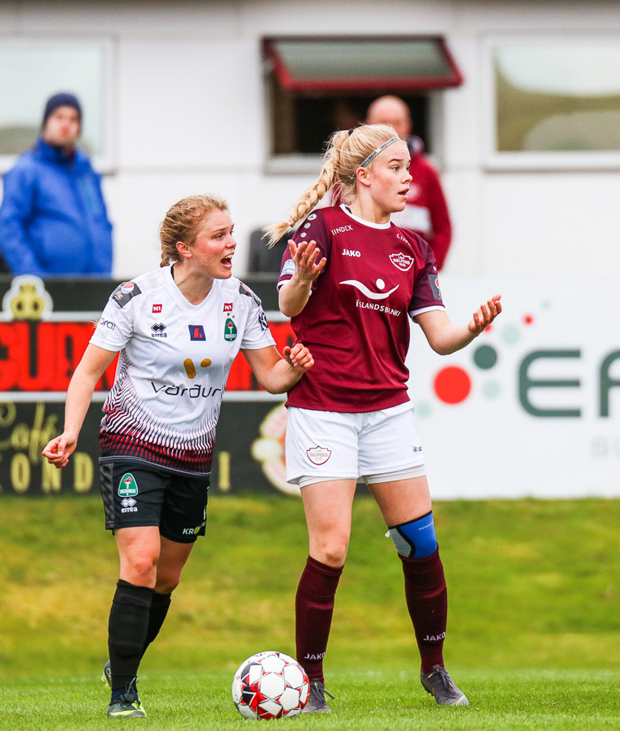 Agla María brýtur á Grace Rapp. Selfyssingar fá aukaspyrnu á eigin vallarhelming.