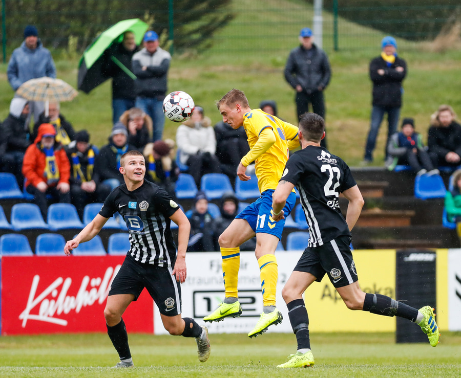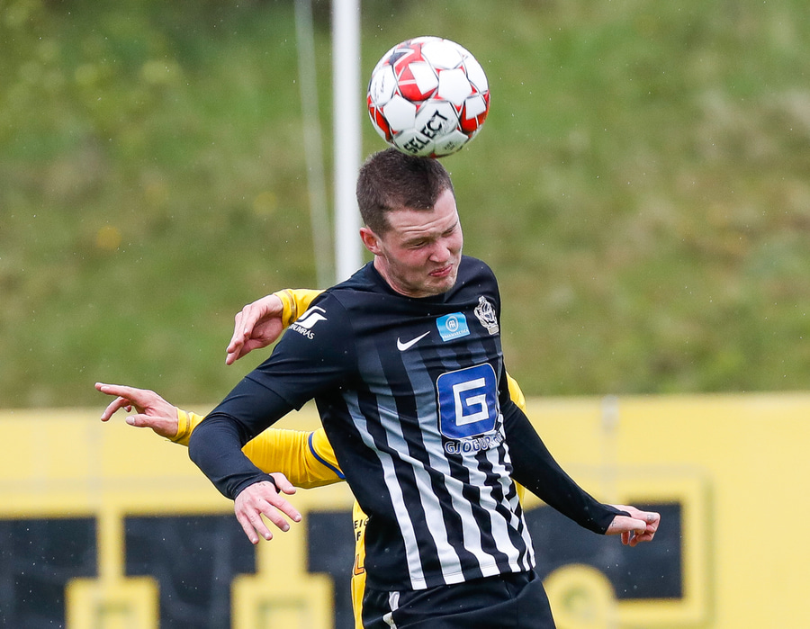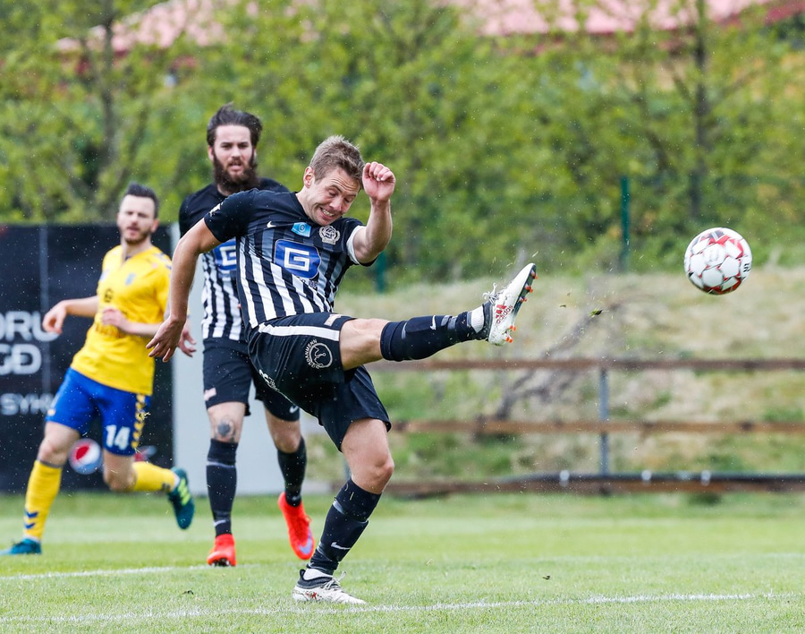 Arnór með spyrnuna og Gauti skallar frá.