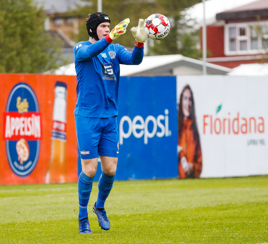 Aron Elí grípur. - Er fljótur að koma boltanum í leik og Frosti er eldsnöggur, en missir boltann aðeins frá sér og Atli bjargar.