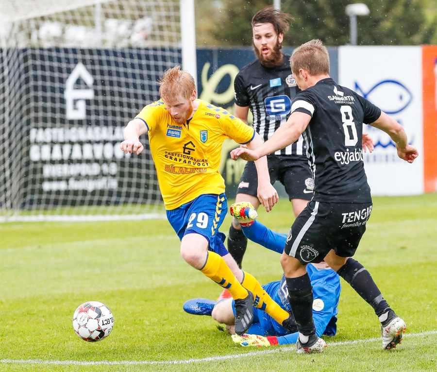 Hver haldiði? - Jú Elís renndi boltanum í gegn á Hans Viktor sem keyrir inn á teiginn en Viktor með geggjaða tæklingu og potar boltanum í horn.